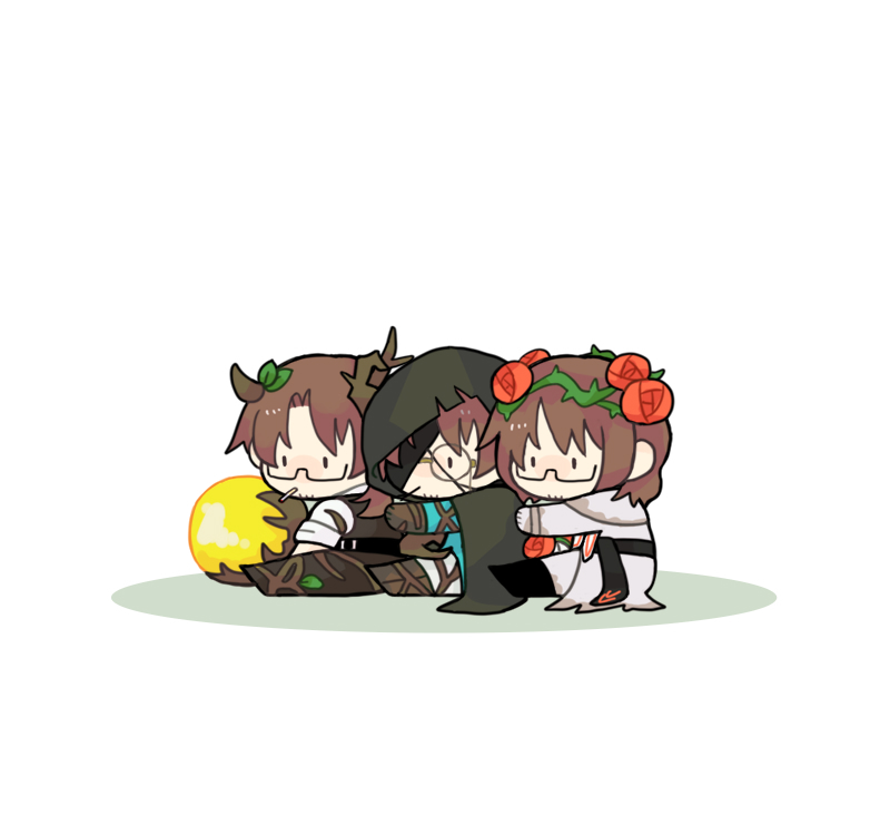 3boys belt black_belt black_cape brown_hair cape chibi cigarette coat crown_of_thorns e.g.o_(project_moon) garden_of_thorns_(e.g.o) glasses gloves golden_apple_(project_moon) gregor_(project_moon) hcc1bai hood hood_up hooded_cape lantern_(e.g.o) legerdemain_(e.g.o) limbus_company long_sleeves male_focus medium_hair multiple_boys multiple_persona project_moon white_cape white_coat white_gloves