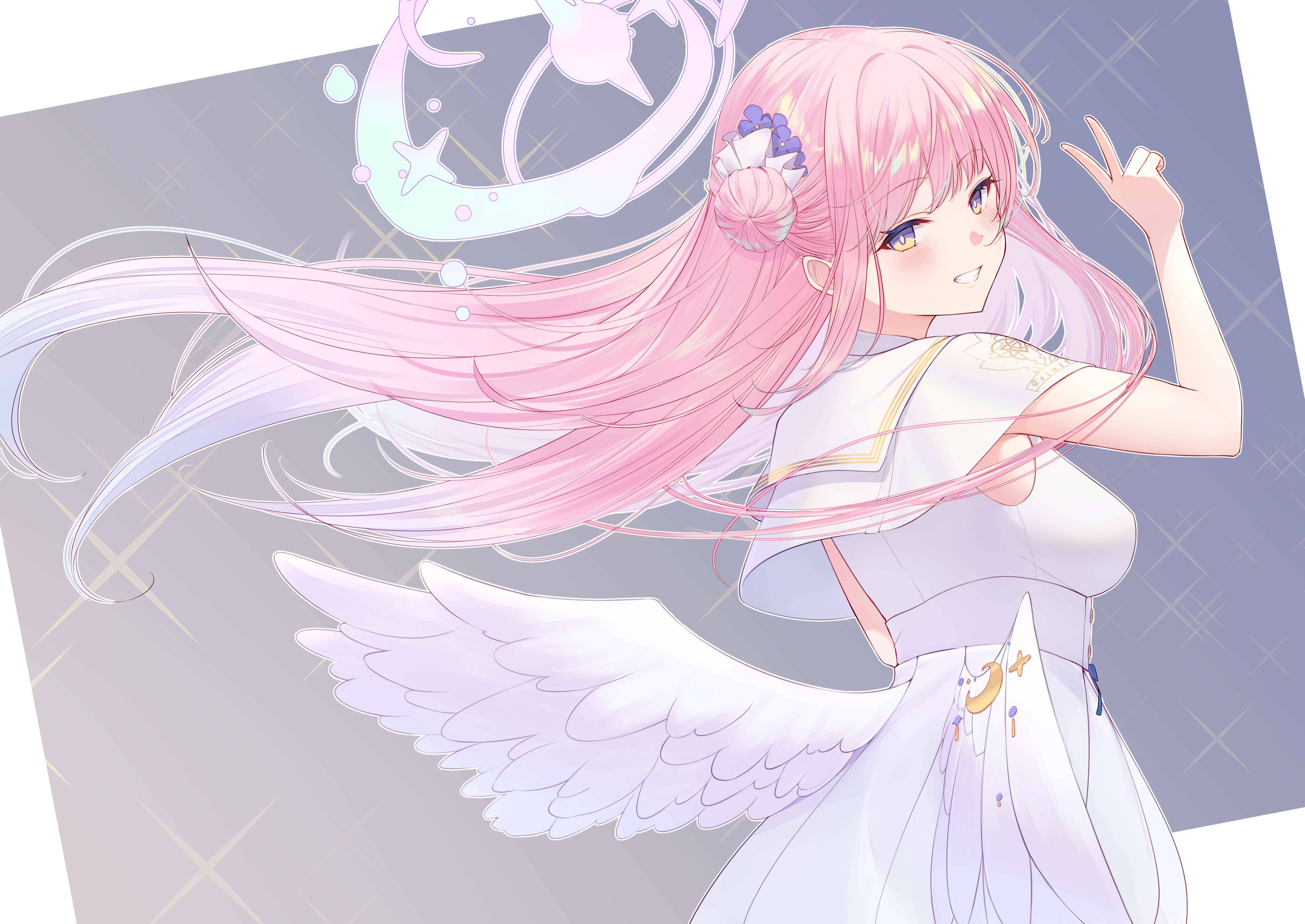 1girl absurdres angel_wings blue_archive blush breasts crescent crescent_pin dress feathered_wings flower grin hair_bun hair_flower hair_ornament halo highres long_hair looking_at_viewer medium_breasts mika_(blue_archive) pink_hair pink_halo purple_flower single_side_bun sleeveless sleeveless_dress smile solo upper_body v white_dress white_wings wings yata_mawari yellow_eyes