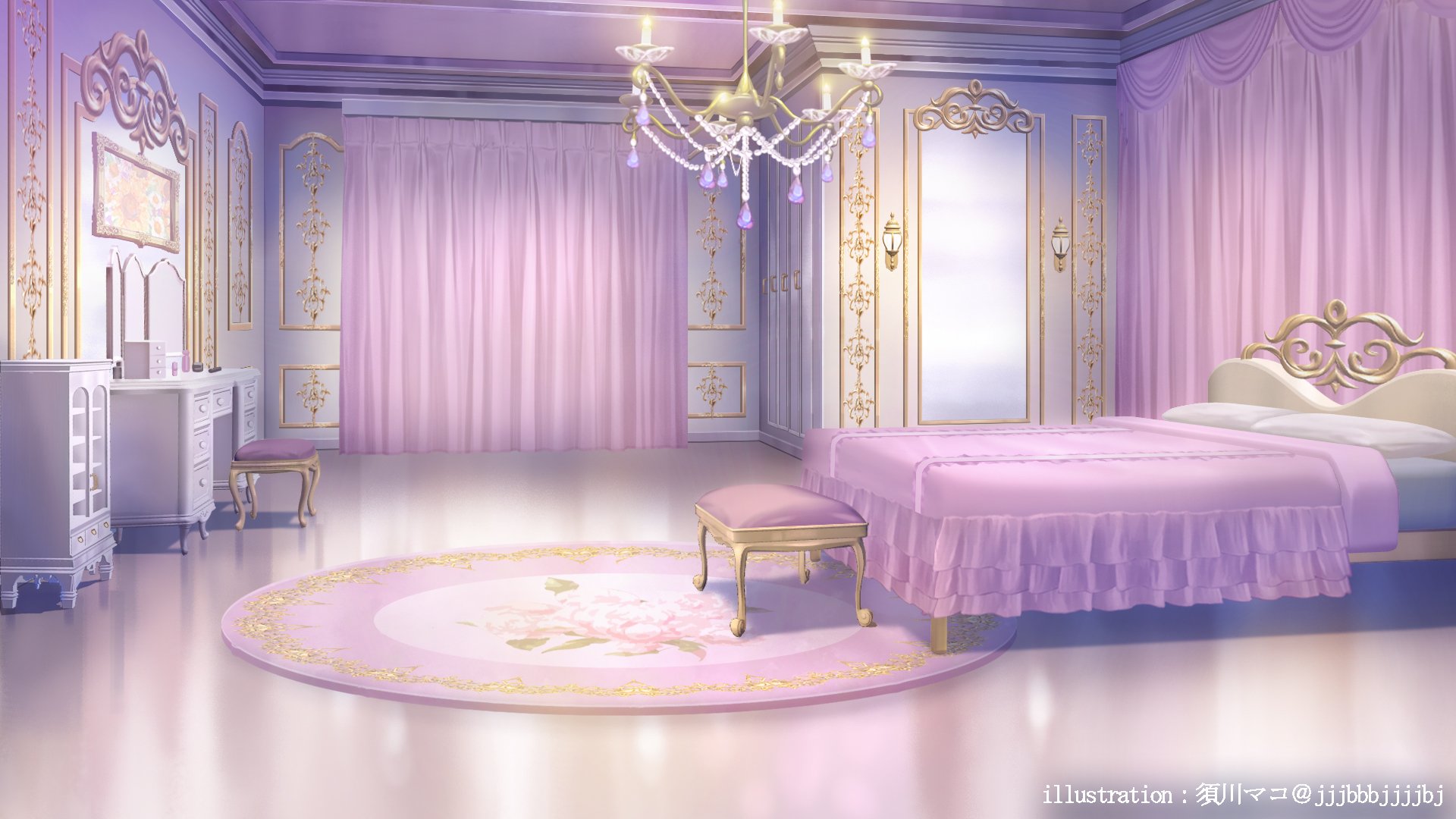 artist_name bed bedroom blanket cabinet chandelier cosmetics curtains highres himeno_aimu indie_virtual_youtuber indoors mirror muntins no_humans official_art painting_(object) pillow rug scenery stool sugawa_mako table vanity_table wall_lamp window