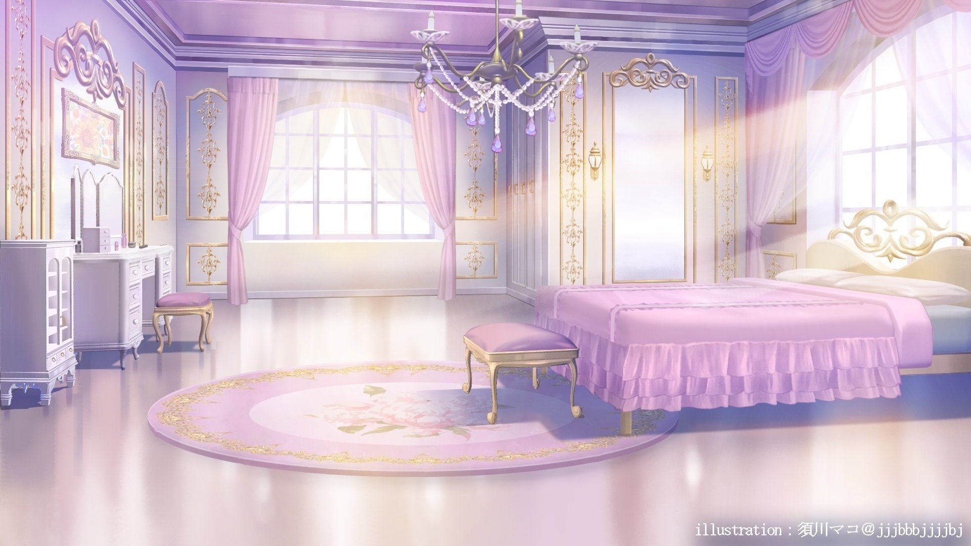 artist_name bed bedroom blanket cabinet chandelier cosmetics curtains day highres himeno_aimu indie_virtual_youtuber indoors muntins no_humans official_art painting_(object) pillow rug scenery stool sugawa_mako sunlight table vanity_table wall_lamp window