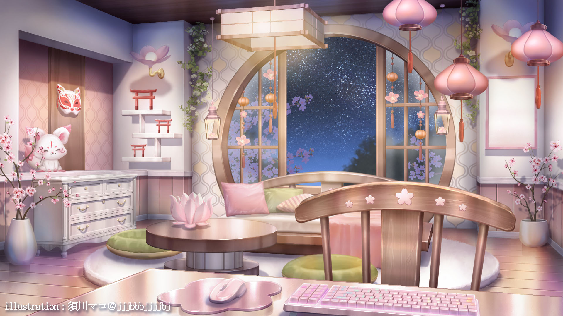 architecture artist_name branch chair cherry_blossoms computer_keyboard computer_mouse couch cushion drawer east_asian_architecture flower fox_mask highres indie_virtual_youtuber indoors kagura_ura lamp lantern mask mirror mousepad_(object) night no_humans official_art open_window paper_lantern pink_flower plant potted_plant round_window rug scenery shelf shouji sky sliding_doors star_(sky) starry_sky stuffed_fox sugawa_mako table tassel themed_object torii unworn_mask vase vines wall_lamp window wooden_chair wooden_floor