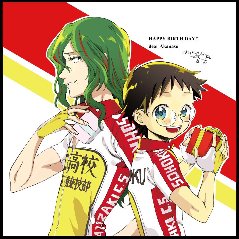 2boys back-to-back black_border black_eyes blue_eyes blush border brown_hair collar collared_shirt eyelashes fingerless_gloves fingernails gift gift_art glasses gloves green_hair grin happy_birthday height_difference holding holding_gift long_hair makishima_saori male_focus mole mole_under_eye multicolored_hair multiple_boys no+bi= onoda_sakamichi open_mouth red_collar red_hair round_eyewear shirt short_hair signature simple_background smile sportswear streaked_hair teeth upper_body wavy_hair white_background white_gloves white_shirt yellow_gloves yowamushi_pedal zipper zipper_pull_tab