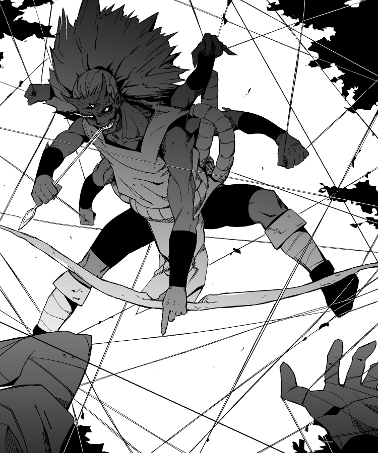 1boy arm_guards arrow_(projectile) arthropod_boy bandages bow_(weapon) collarbone dark-skinned_male dark_skin extra_arms greyscale holding holding_arrow holding_bow_(weapon) holding_weapon horns kidoumaru_(naruto) long_hair metric80019 monochrome monster_boy mouth_hold muscular muscular_male naruto_(classic) naruto_(series) ninja solo_focus spider_boy string teeth tree weapon