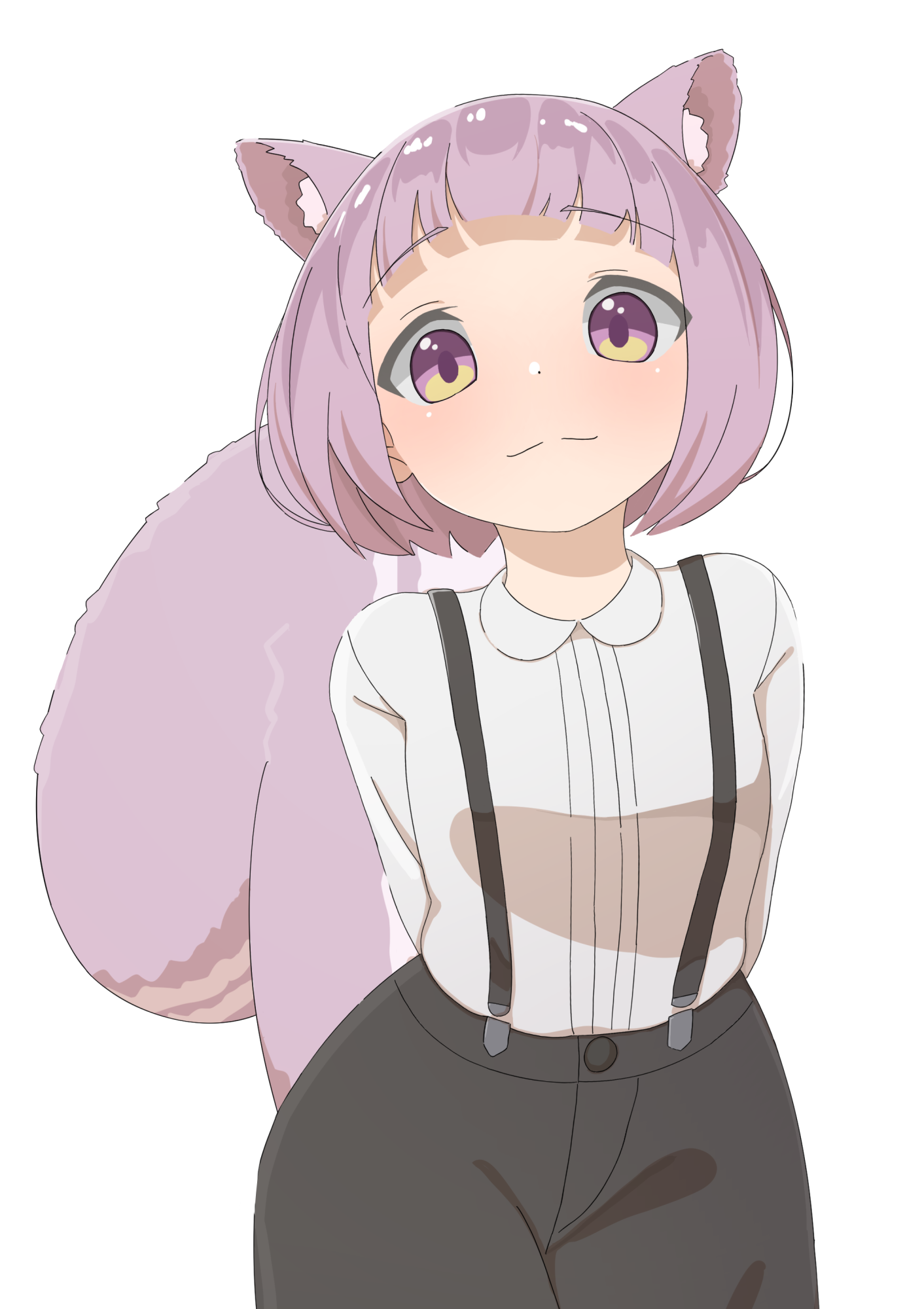 1girl animal_ears arms_behind_back black_pants closed_mouth cowboy_shot highres kumacy_0 long_sleeves looking_at_viewer multicolored_eyes original pants purple_eyes purple_hair shirt short_hair shoulder_strap simple_background solo squirrel_ears squirrel_girl squirrel_tail standing tail white_background white_shirt yellow_eyes