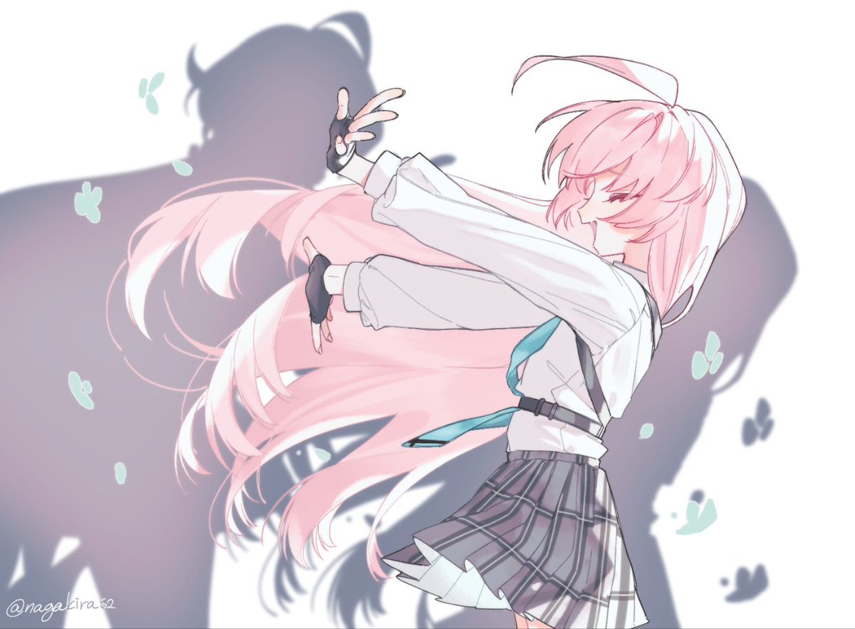 1girl ahoge black_gloves blue_archive blue_necktie closed_eyes commentary_request cowboy_shot fingerless_gloves fingernails from_side gloves grey_skirt hoshino_(blue_archive) korean_commentary long_hair long_sleeves nagakiras2 necktie open_mouth pink_hair pleated_skirt profile shirt skirt smile solo twitter_username white_shirt