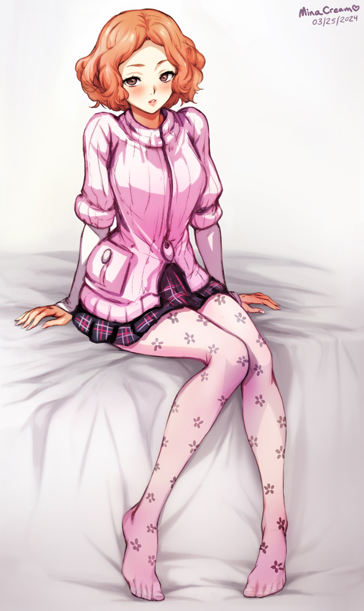 1girl artist_name blush brown_eyes commentary dated female_focus floral_print highres layered_sleeves long_sleeves mina_cream no_shoes okumura_haru orange_hair pantyhose persona persona_5 pink_sweater plaid_clothes plaid_skirt print_pantyhose ribbed_sweater school_uniform short_over_long_sleeves short_sleeves shuujin_academy_school_uniform skirt solo sweater white_pantyhose