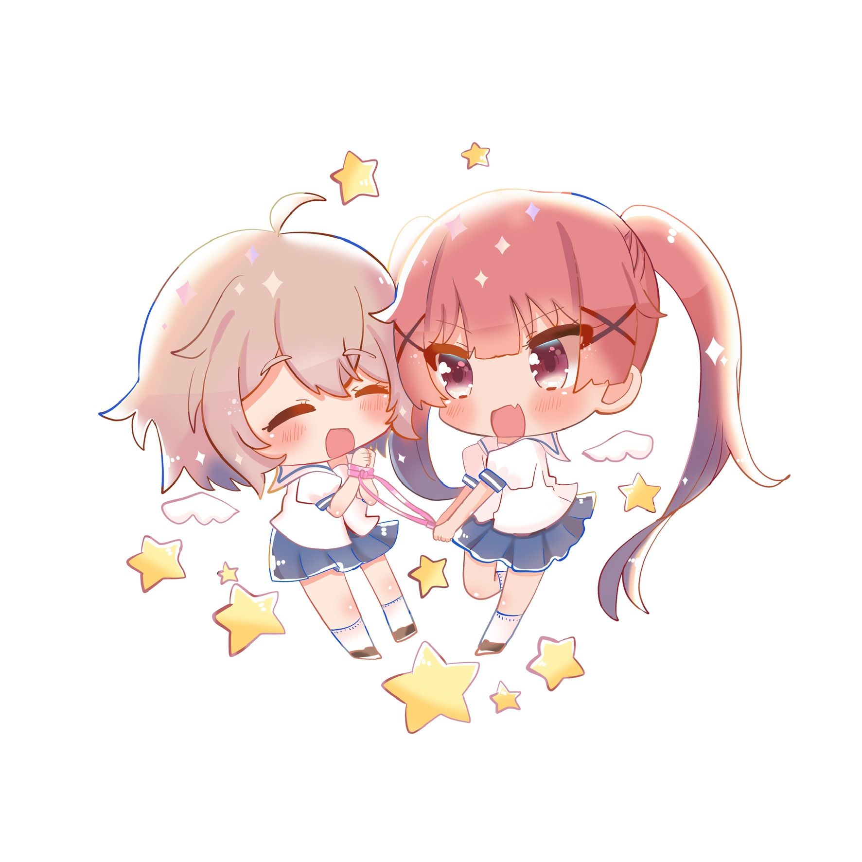 ankle_socks blue_skirt blush brown_footwear brown_hair chibi chibi_only child closed_eyes fang highres konomori_kanon long_hair open_mouth pleated_skirt red_hair restrained shirt short_hair short_sleeves skin_fang skirt socks star_(symbol) tanemura_koyori white_background white_shirt white_socks xhfn4743