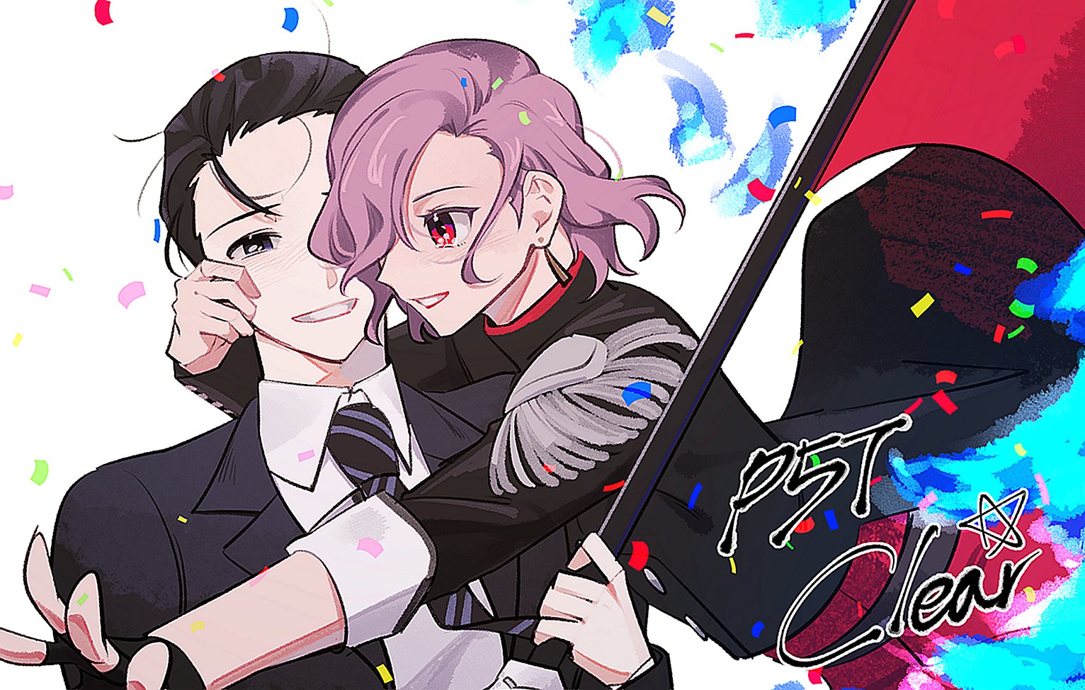 1boy 1girl black_gloves black_hair black_jacket blue_eyes blush collared_shirt confetti earrings elulit2 epaulettes erina_(persona_5_tactica) fingerless_gloves flag gloves grin hair_over_one_eye hand_on_another's_cheek hand_on_another's_face holding holding_flag jacket jewelry kasukabe_toshiro long_sleeves looking_at_another necktie open_clothes open_jacket outstretched_arm persona persona_5 persona_5_tactica purple_hair red_eyes red_skirt shirt short_hair simple_background single_epaulette skirt smile striped_clothes striped_necktie upper_body white_background white_shirt wing_collar