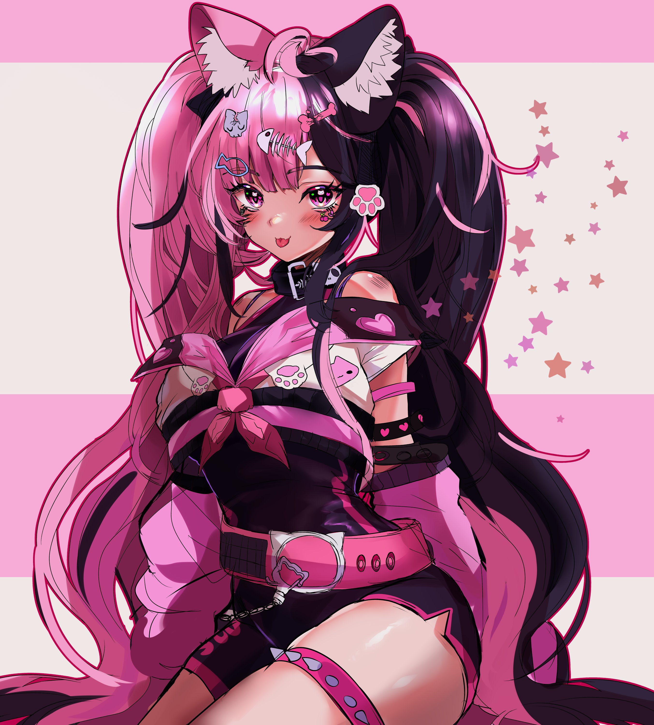 1girl :3 absurdres animal_ears arms_at_sides belt black_hair black_leotard blush breasts cat_ears cat_girl closed_mouth collar cowboy_shot cropped_shirt eyebrows eyelashes female_focus fish_skeleton_hair_ornament heart heart-shaped_pupils highres indie_virtual_youtuber jacket jacket_partially_removed leotard long_hair looking_at_viewer medium_breasts multicolored_hair nyukururu off-shoulder_shirt off_shoulder pink_background pink_belt pink_eyes pink_hair pink_jacket pink_shirt shirt simple_background solo spikes suwie_(vtuber) suwie_(vtuber)_(new) symbol-shaped_pupils thigh_strap thighs tongue tongue_out twintails two-tone_background two-tone_hair two-tone_shirt very_long_hair virtual_youtuber white_background white_shirt
