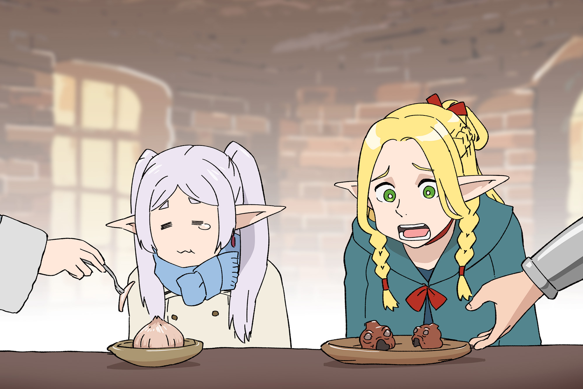 1boy 3girls blonde_hair blue_scarf blurry braid choker cloak coat commentary_request crimes_against_food crossover crying depth_of_field dungeon_meshi earrings eating elf feeding fern_(sousou_no_frieren) floating_earrings forehead frieren garlic hair_tubes half_up_half_down_braid highres hood hooded_cloak indoors jewelry laios_touden long_hair long_sleeves marcille_donato multiple_girls out_of_frame parted_bangs plate pointy_ears ponytail red_choker sad scarf sidelocks sousou_no_frieren surprised table thick_eyebrows tri_braids ueyama_michirou wavy_mouth white_hair winter_clothes winter_coat