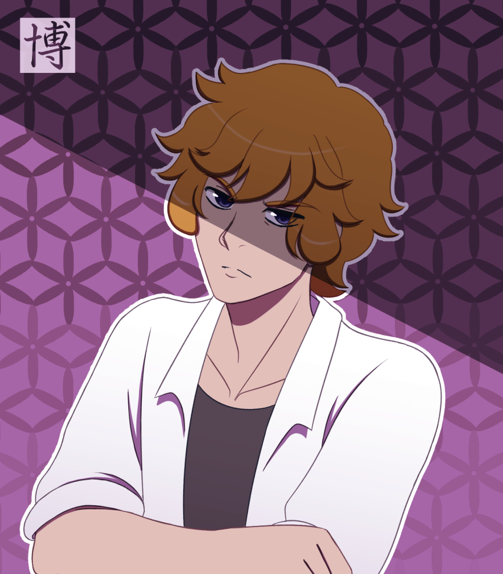 1boy 1other androgynous black_shirt blonde_hair crossed_arms frown gidget_bordelle jacket male_focus our_wonderland purple_eyes shirt short_hair solo white_jacket