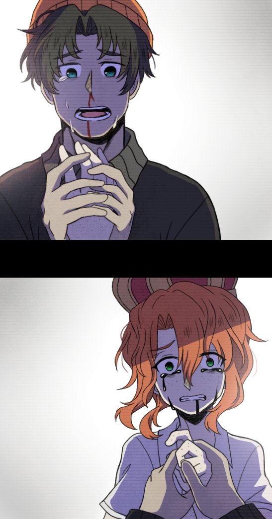 2boys beanie black_hair black_jacket black_tears blood colored_tears crown crying crying_with_eyes_open genzou_ichihara hat holding_hands jacket multiple_boys nosebleed open_mouth orange_hair orlam_brewbacher our_wonderland rattail shirt tears white_shirt ximsol182