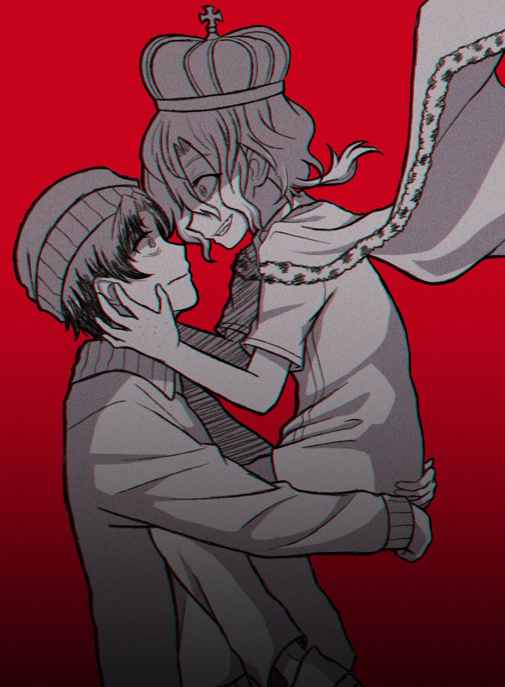 2boys beanie cape carrying crown evil_grin evil_smile fur-trimmed_cape fur_trim genzou_ichihara grin hands_on_another's_face hat jacket multiple_boys orlam_brewbacher our_wonderland rattail red_background shirt short_hair smile wavy_hair white_shirt ximsol182