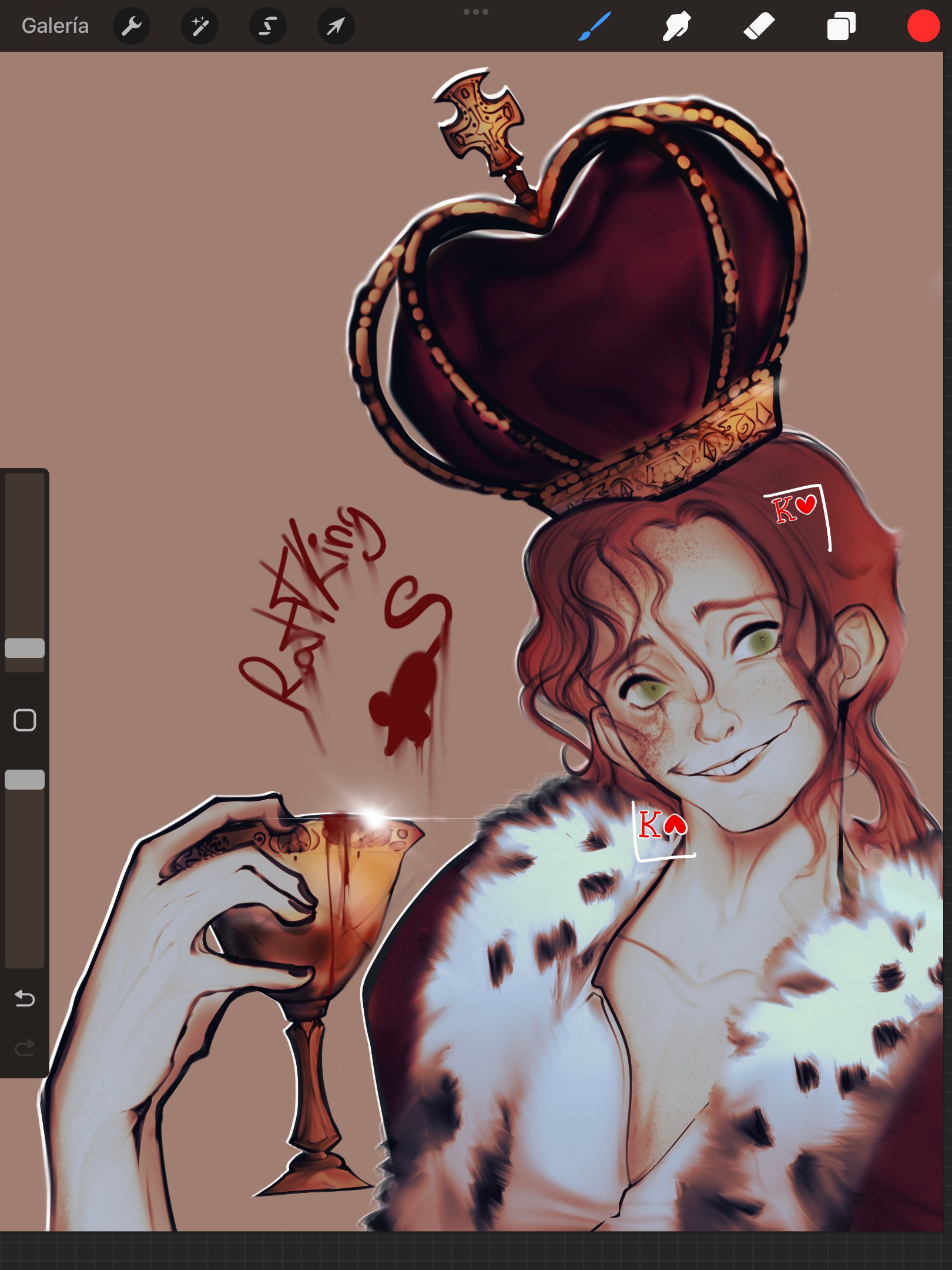 1boy blood cape crown cup evil_smile fur_trim green_eyes highres holding holding_cup orange_hair orlam_brewbacher our_wonderland rattail shirt short_hair smile svctory wavy_hair white_shirt