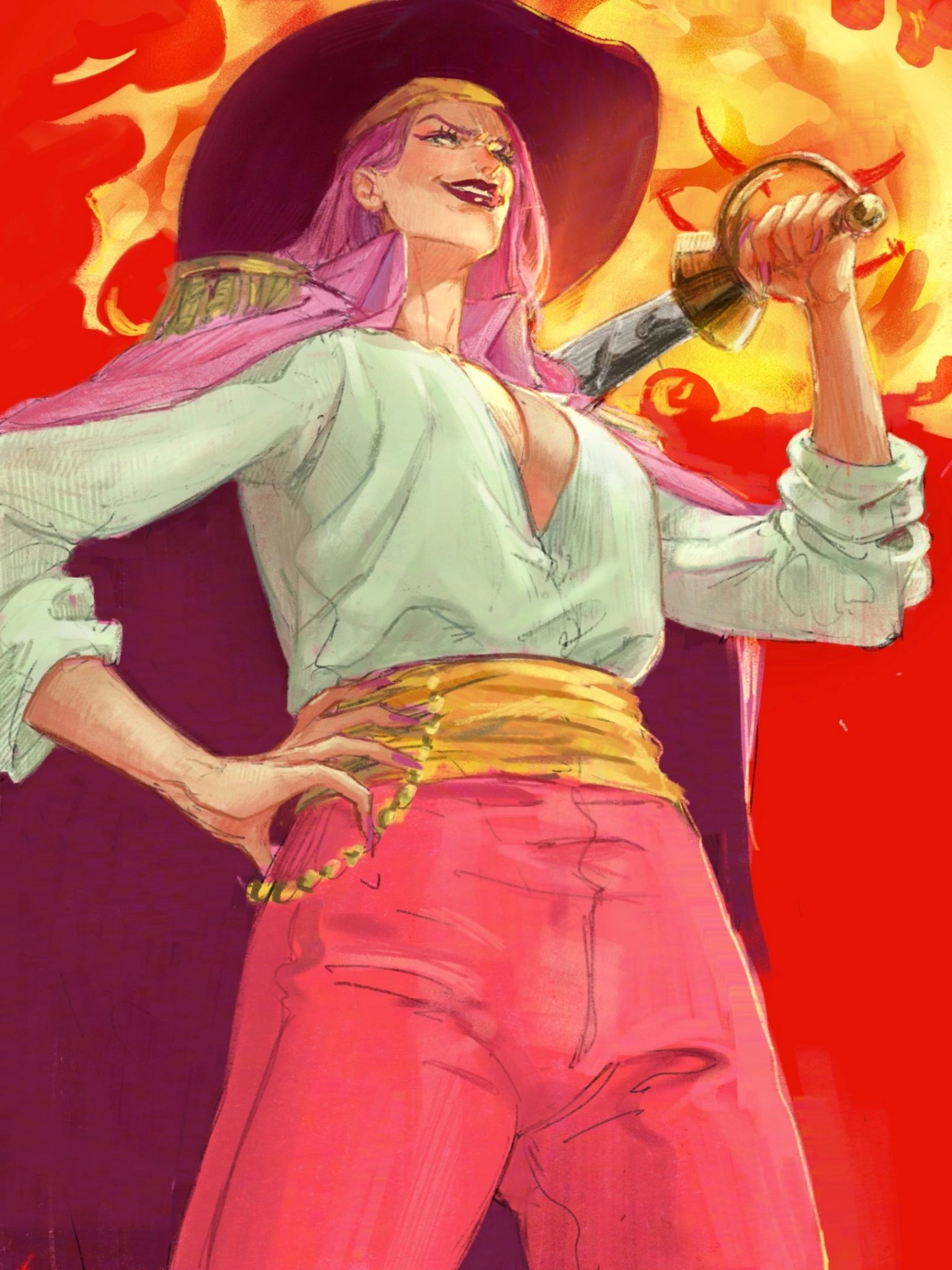 1boy 1girl black_hat bulic-h charlotte_linlin coat commentary english_commentary epaulettes fire hat highres holding holding_sword holding_weapon lips lipstick long_hair makeup nail_polish one_piece pants pink_hair pink_nails pink_pants prometheus_(one_piece) red_background red_lips shirt simple_background smile sword teeth weapon white_shirt