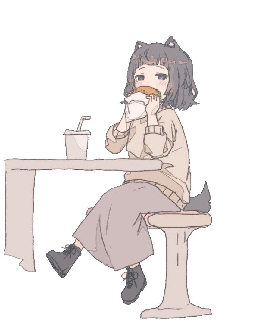 1girl animal_ears black_boots black_eyes black_hair blunt_bangs blush bob_cut boots brown_skirt brown_sweater burger cup disposable_cup dog_ears dog_girl dog_tail drink drinking_straw eating food full_body grey_skirt holding holding_burger holding_food long_skirt long_sleeves looking_at_viewer medium_hair original short_hair simple_background sitting skirt solo stool sweater table tail uzoumuzo white_background