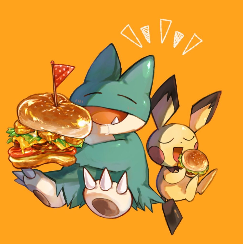 burger cheese claws closed_eyes commentary_request dot_nose drooling eating fang flag food gen_2_pokemon gen_4_pokemon holding holding_burger holding_food lettuce munchlax nintendo no_humans open_mouth orange_background pichu pokemon pokemon_(creature) simple_background sitting smile tail tomato torisan_7_7