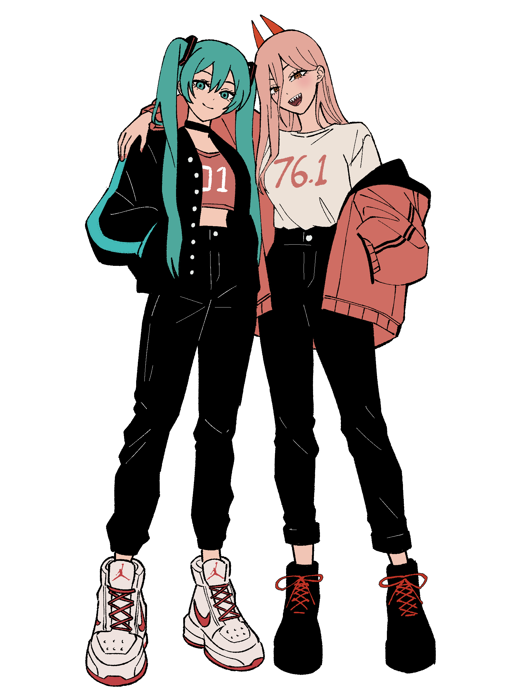 2girls absurdres black_pants blue_eyes blue_hair demon_girl demon_horns group_picture hatsune_miku highres horns looking_at_viewer multiple_girls numbered pants pink_hair ponytail power_(chainsaw_man) sharp_teeth shirt shoes sneakers sweater t-shirt teeth vocaloid zeon_(zzeeonn)