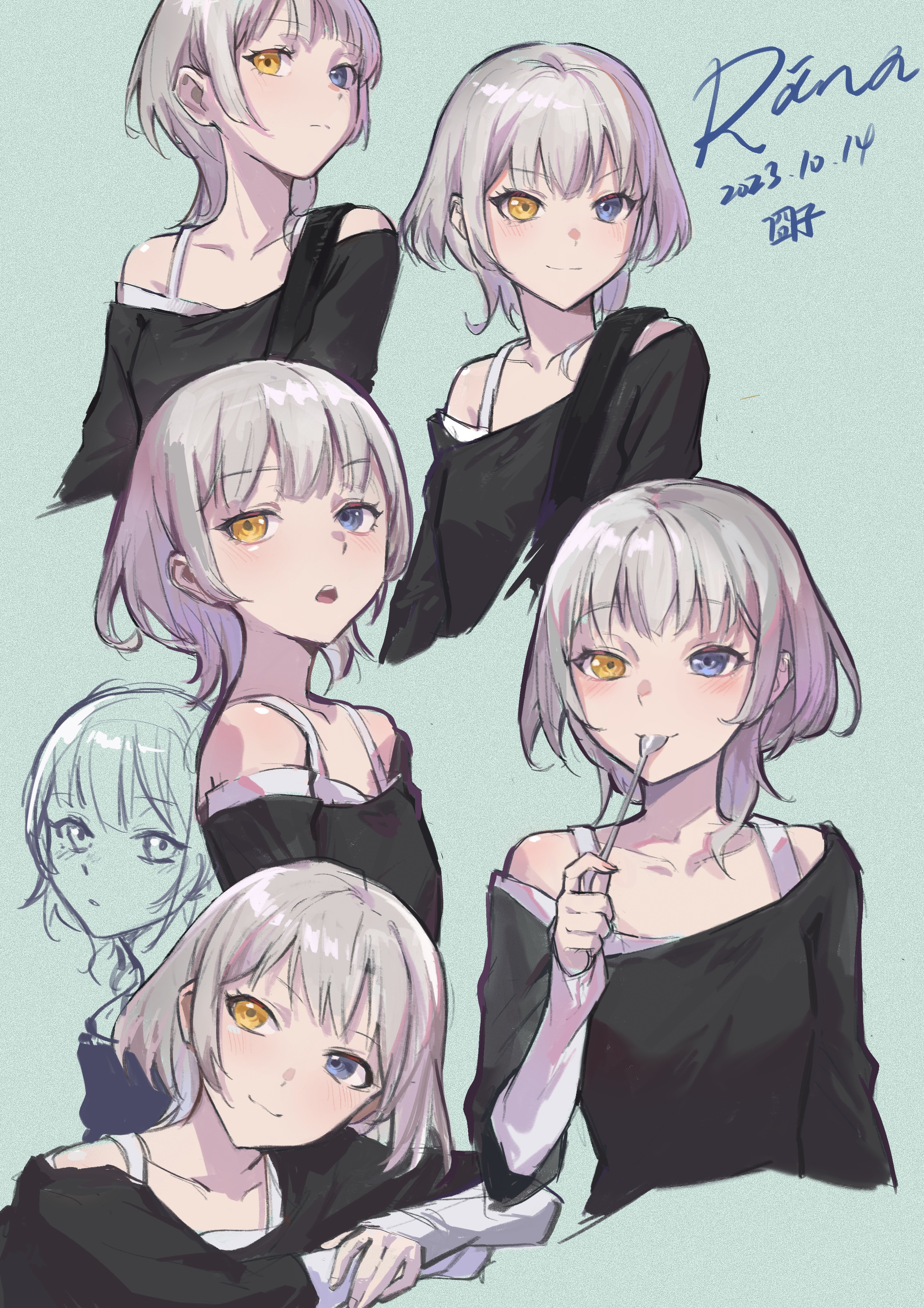 1girl absurdres bang_dream! bang_dream!_it's_mygo!!!!! black_shirt blue_eyes blush character_name closed_mouth commentary dated green_background grey_hair heterochromia highres holding holding_spoon jiong-zi kaname_raana layered_sleeves long_sleeves looking_at_viewer medium_hair multiple_views off-shoulder_shirt off_shoulder open_mouth parted_lips shirt short_over_long_sleeves short_sleeves simple_background spoon utensil_in_mouth yellow_eyes