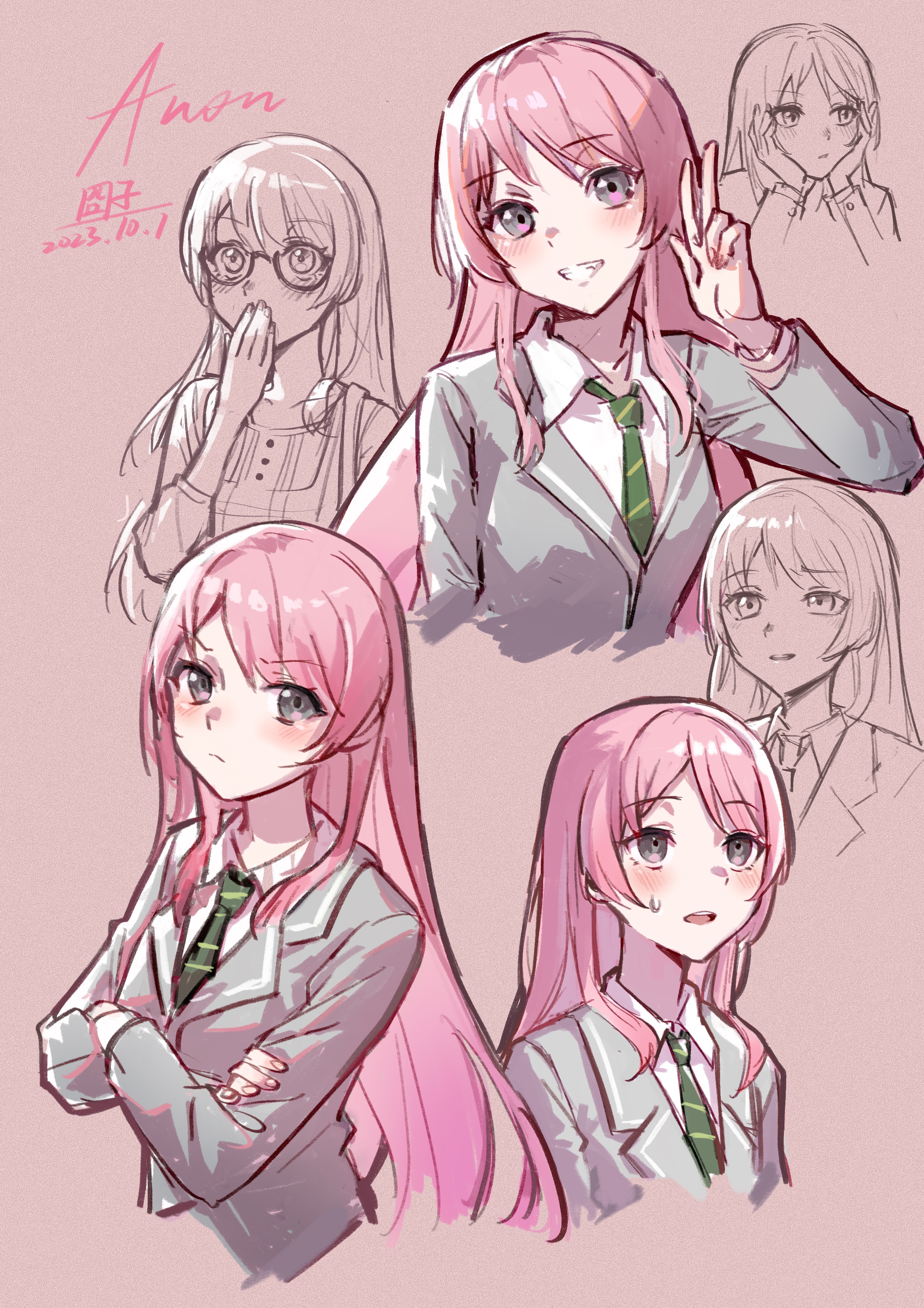 1girl absurdres bang_dream! bang_dream!_it's_mygo!!!!! blush character_name chihaya_anon closed_mouth collared_shirt commentary_request covering_own_mouth dated dress frown glasses green_necktie grey_eyes grey_jacket grin hand_over_own_mouth hand_up haneoka_school_uniform highres jacket jiong-zi long_hair long_sleeves looking_at_viewer multiple_views necktie parted_lips pink_background pink_hair school_uniform shirt simple_background smile sweatdrop w white_shirt