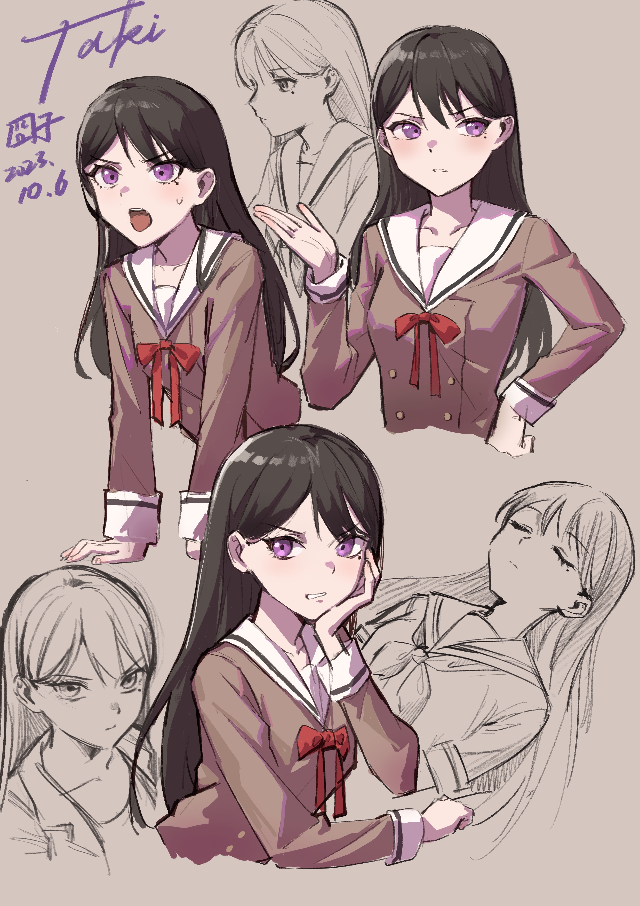 1girl absurdres bang_dream! bang_dream!_it's_mygo!!!!! brown_background brown_hair brown_shirt character_name clenched_teeth closed_eyes closed_mouth commentary dated hanasakigawa_school_uniform highres jiong-zi long_hair long_sleeves mole mole_under_eye multiple_views neck_ribbon open_mouth parted_lips purple_eyes red_ribbon ribbon sailor_collar school_uniform serafuku shiina_taki shirt simple_background teeth white_sailor_collar