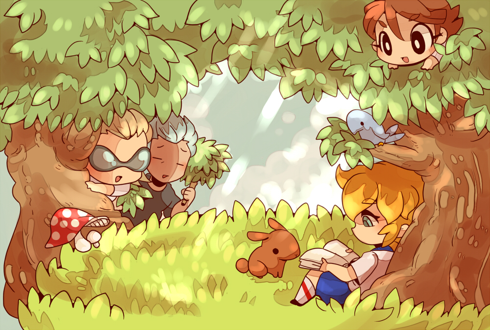 4boys bird black_shirt blonde_hair blue_bird branch brown_hair brown_rabbit domon_asuka grass grey_hair holding holding_branch ichinose_kazuya in_tree inazuma_eleven_(series) kidou_yuuto kotomaru_(kotokoto_kottan) male_focus minaho_kazuto multiple_boys mushroom open_mouth outdoors rabbit reading shirt short_hair short_sleeves socks sunglasses sunlight tree under_tree white_shirt white_socks