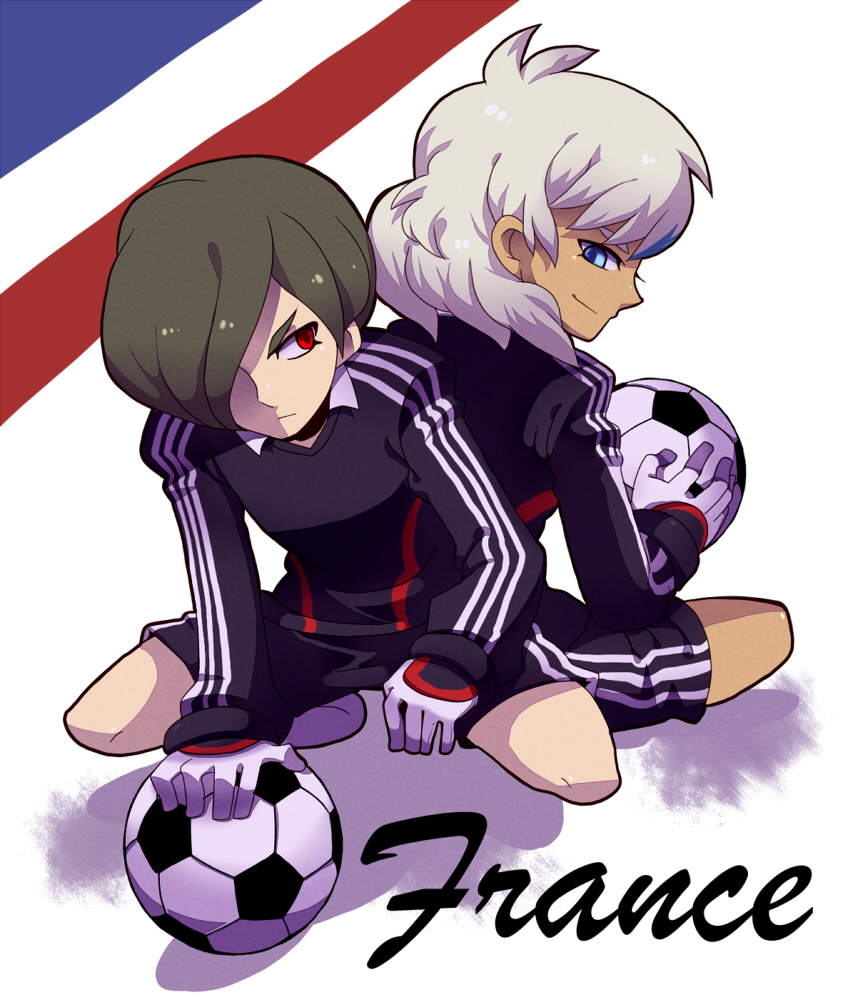 2boys ball black_shirt black_shorts blue_eyes emile_razzano french_flag full_body gloves hair_over_one_eye holding holding_ball inazuma_eleven inazuma_eleven_(series) kotomaru_(kotokoto_kottan) ladji_paara looking_back looking_to_the_side male_focus multiple_boys shirt short_hair shorts smile soccer_ball solo squatting white_gloves