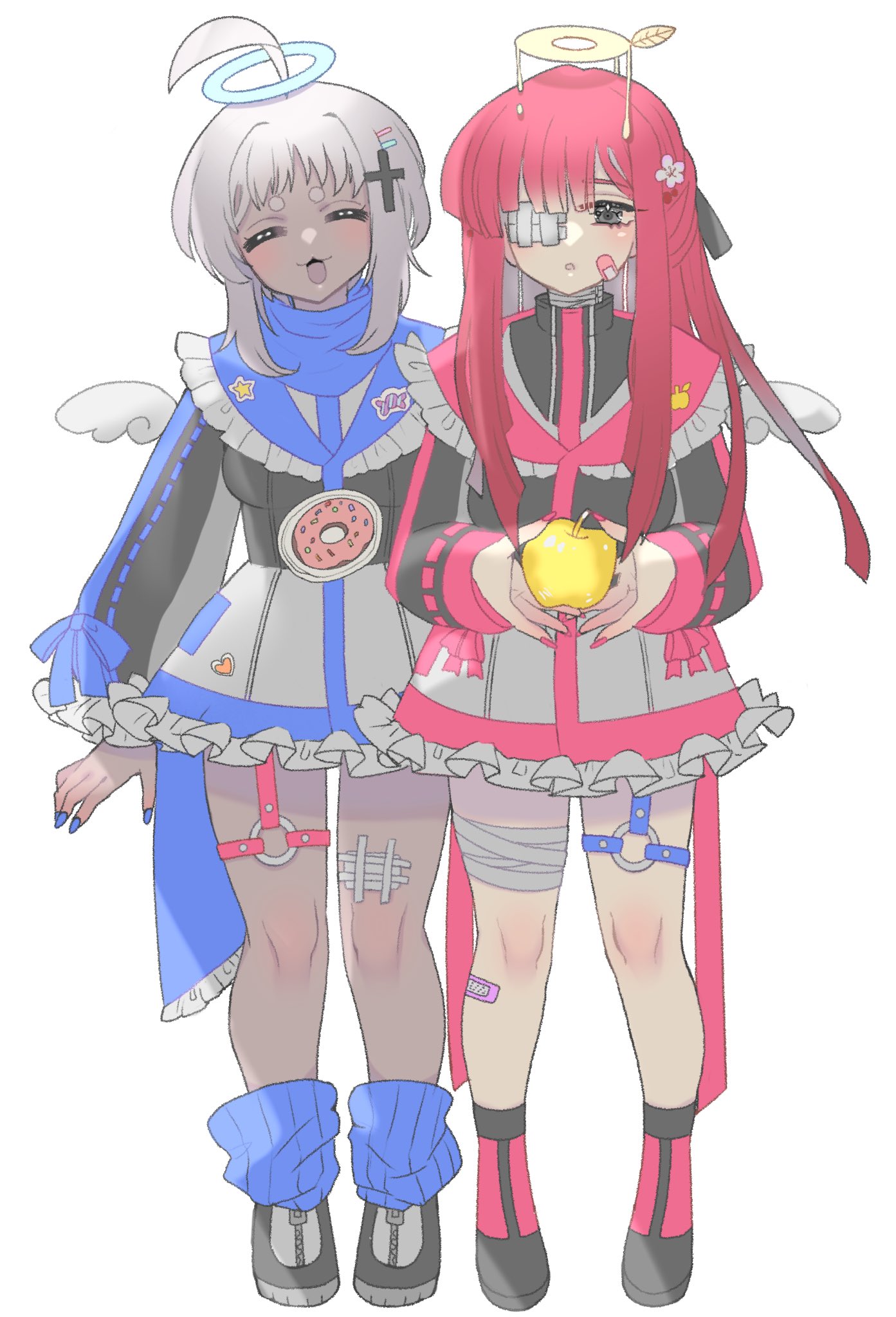 2girls apple aya_(project_moon) black_bow black_eyes black_footwear black_jacket blue_socks boots bow closed_eyes dark-skinned_female dark_skin feather_hair_ornament feathers food frilled_skirt frills fruit full_body gauze gauze_over_eye golden_apple hair_bow hair_ornament halo highres holding holding_food holding_fruit jacket limbus_company long_hair melting_halo multiple_girls njaja_kanja o-ring o-ring_thigh_strap open_mouth pink_hair project_moon simple_background skirt smile socks thigh_strap very_long_hair white_background white_skirt yuri_(project_moon)
