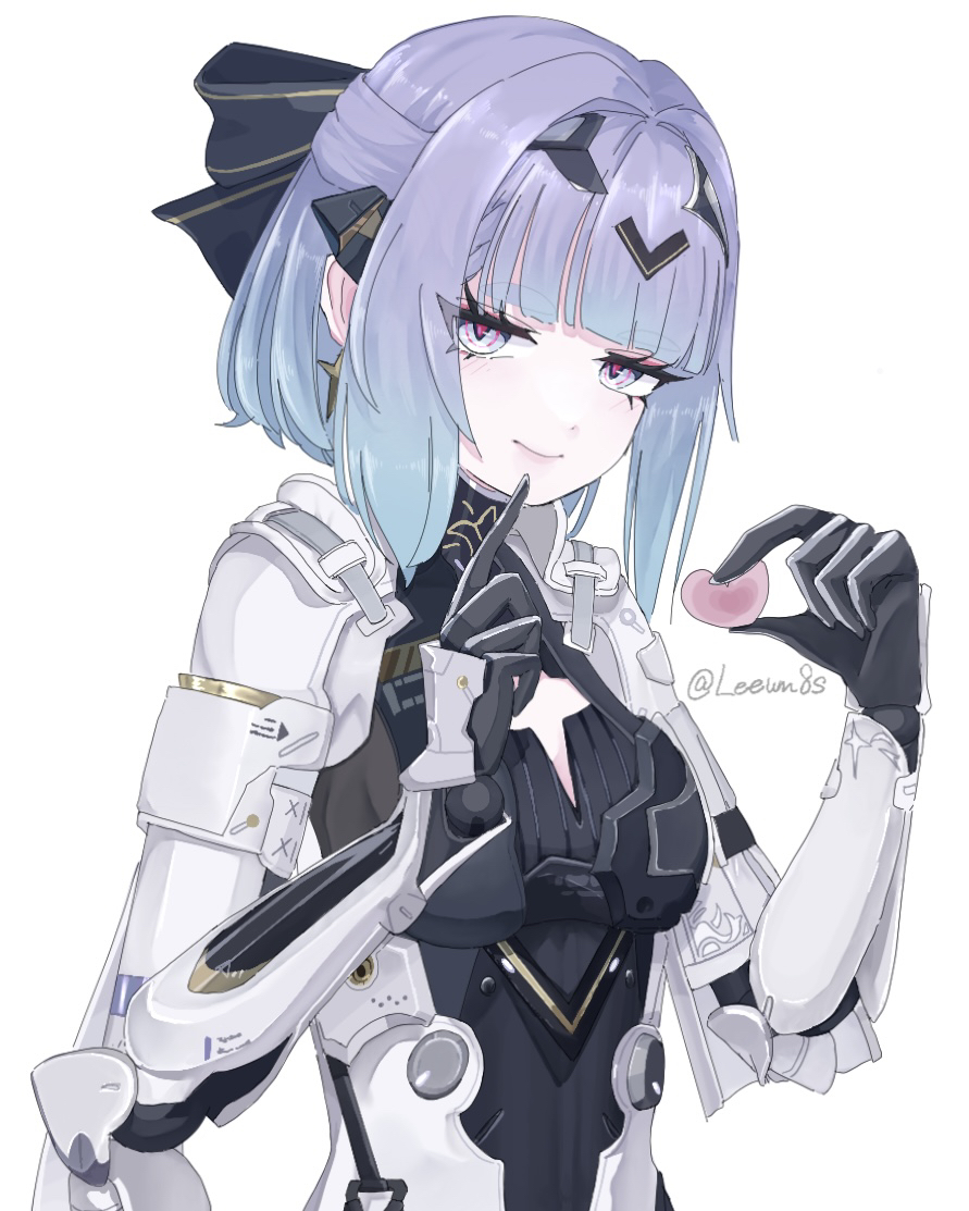 1girl alisa:_echo_(pgr) alisa_(pgr) artist_request black_bodysuit black_bow blonde_hair blue_eyes bob_cut bodysuit bow hair_bow hair_intakes headgear leeum8s looking_at_viewer mechabare mechanical_arms medium_hair punishing:_gray_raven red_pupils ringed_eyes sidelocks solo twitter_username white_background