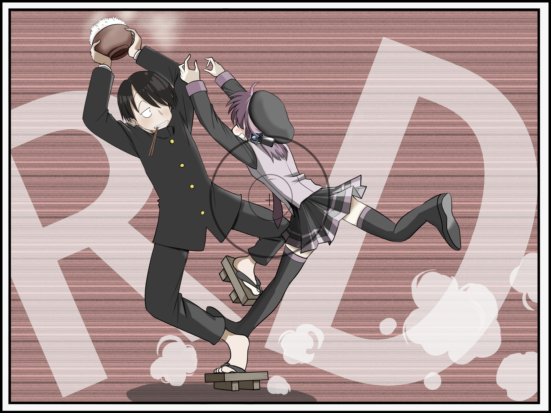 1boy 1girl arms_up beret black_footwear black_hair black_hat black_jacket black_pants black_shirt black_skirt blush bowl brown_background chopsticks chopsticks_in_mouth commentary_request crossover drooling dust_cloud eichi1219 full_body gakuran geta grin hair_over_eyes hair_over_one_eye half-closed_eyes hat highres holding holding_bowl jacket jumping kyuukyoku_choujin_r leaning_back long_hair long_sleeves looking_at_another motion_lines no_socks one_eye_covered pants pleated_skirt r_tanaka_ichirou reaching rice rice_bowl robot_ears school_uniform shirt short_hair skirt smile speed_lines standing standing_on_one_leg steam trait_connection utane_uta utau vest viewfinder