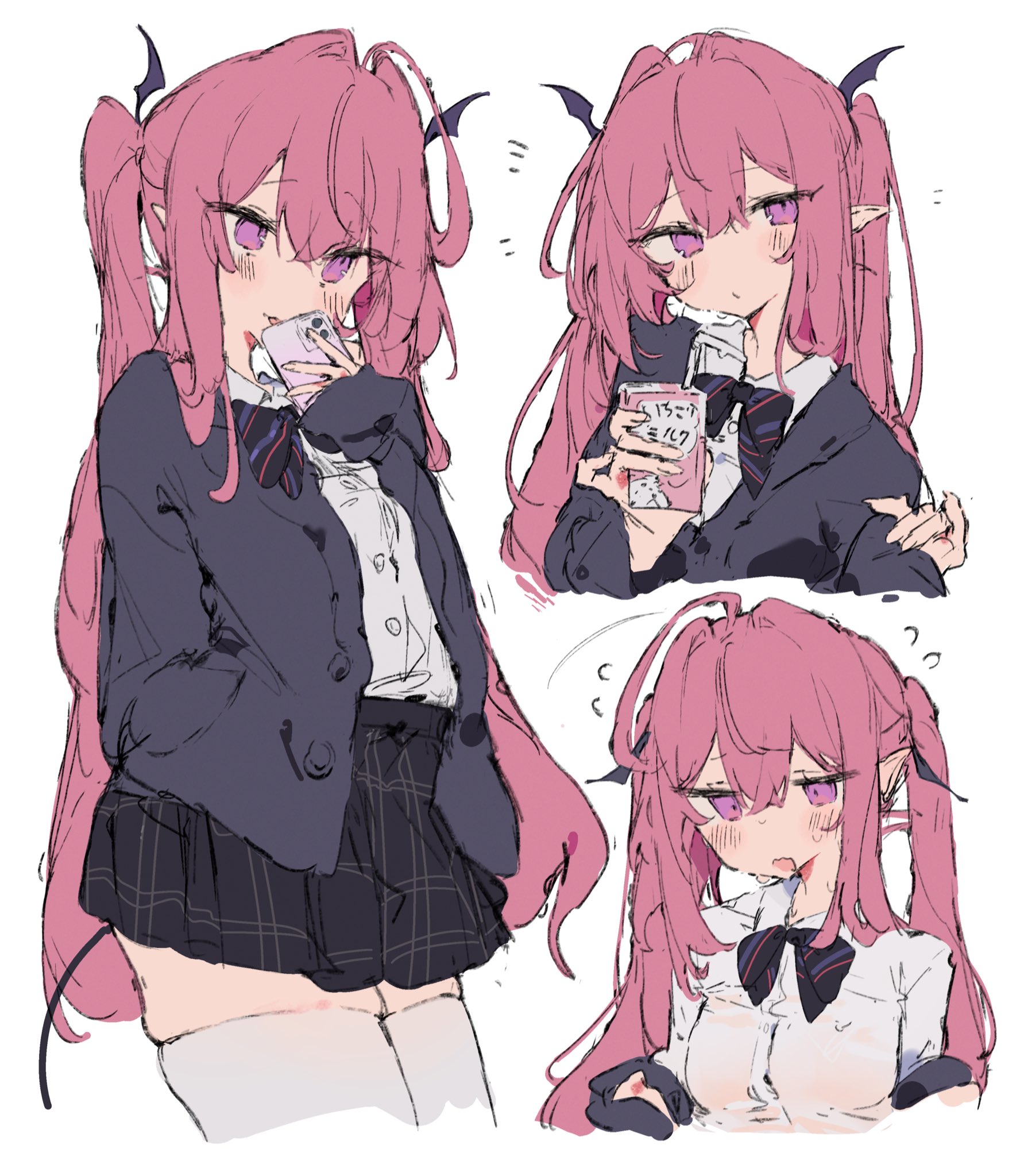 1girl ahoge black_jacket black_skirt black_wings blazer blush bow bunchi buttons cellphone collared_shirt demon_girl demon_wings drink_carton drinking_straw hair_between_eyes hair_intakes highres holding holding_milk_carton holding_phone jacket long_hair low_wings milk_carton multiple_views open_clothes open_jacket open_mouth original phone pink_hair pleated_skirt school_uniform shirt simple_background skirt smartphone socks striped_bow sweat tail twintails very_long_hair white_background white_shirt white_socks wings