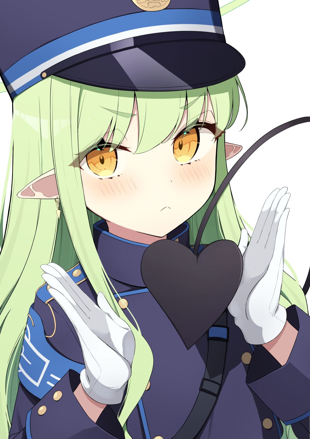 1girl black_hat black_shirt black_tail blue_archive blush closed_mouth demon_tail earrings gloves green_hair hat hikari_(blue_archive) highres jewelry long_hair long_sleeves peaked_cap pointy_ears sasai_nakoto shirt sidelocks simple_background single_earring solo tail upper_body white_background white_gloves yellow_eyes
