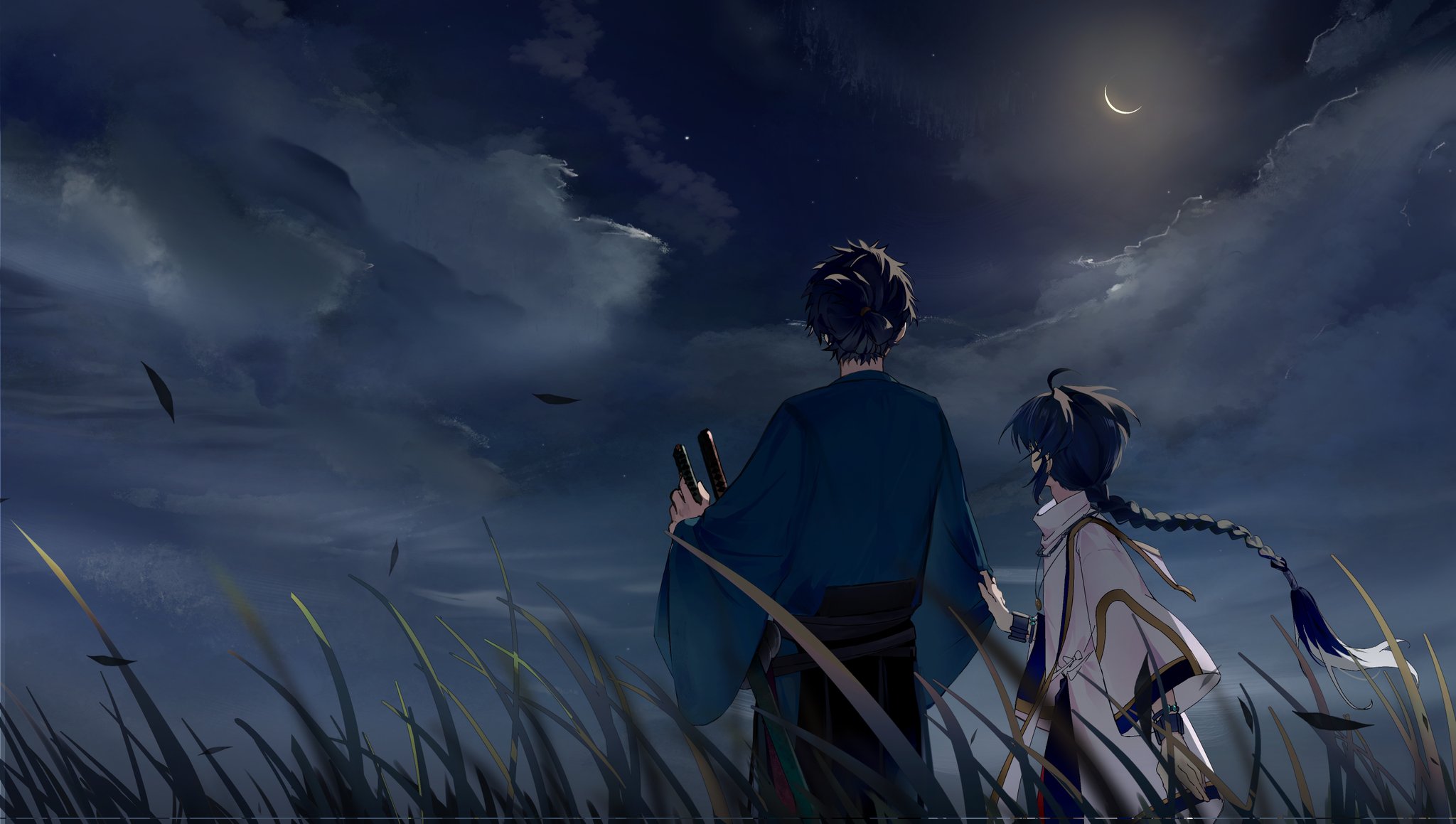 1boy 1other ahoge amulet androgynous black_hakama blue_kimono bracelet braid braided_ponytail clothes_grab cloud cloudy_sky crescent_moon dark fate/samurai_remnant fate_(series) from_behind grass hakama highres japanese_clothes jewelry jiang_(bolidididi) katana kimono leaf looking_afar miyamoto_iori_(fate) moon necklace night sheath sheathed sidelocks single_braid sky grabbing_another's_sleeve sword tall_grass topknot weapon wind yamato_takeru_(fate)