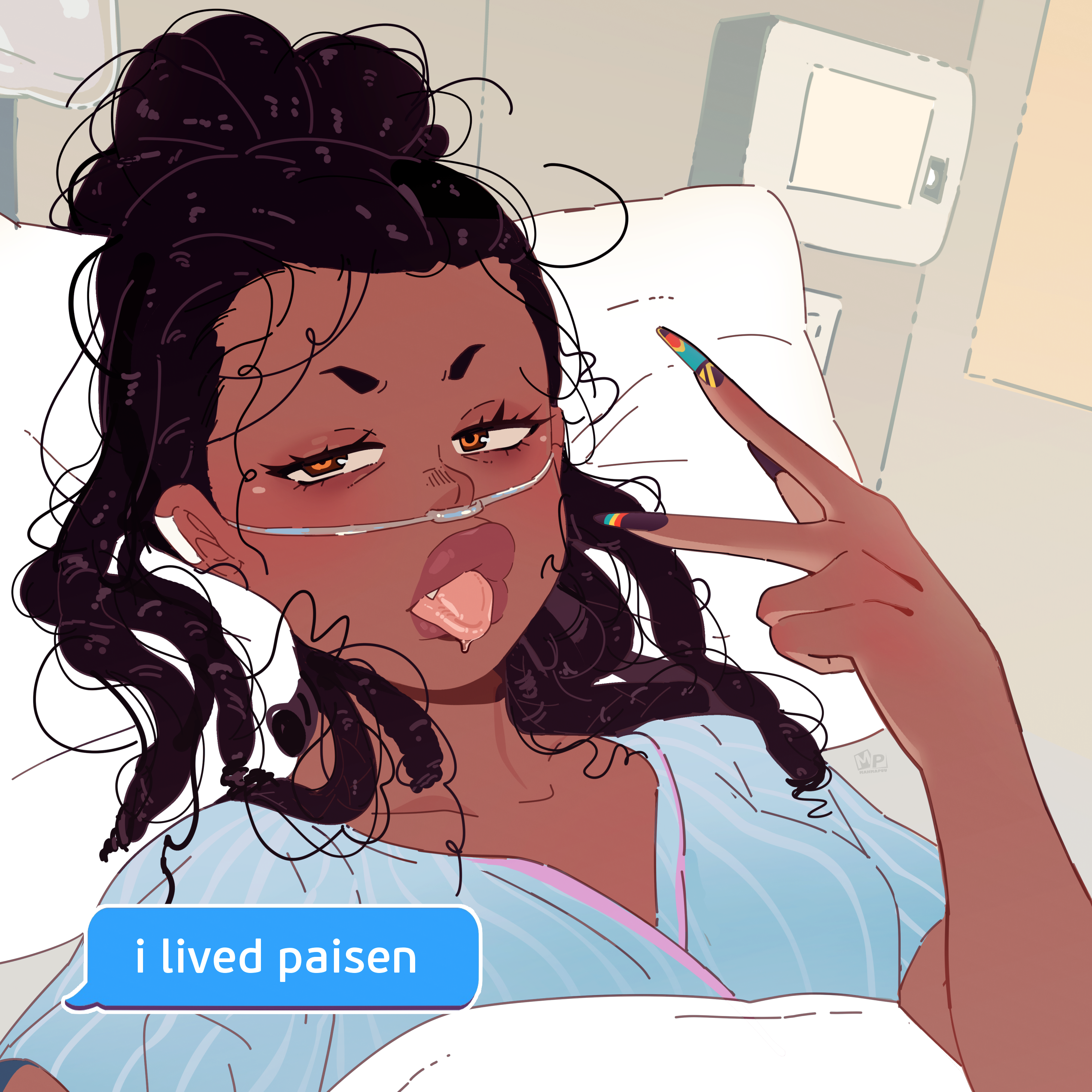 1girl absurdres alternate_skin_color alternate_universe bed black_hair brown_eyes chocotoro commentary dark-skinned_female dark_skin dreadlocks english_commentary english_text highres hospital_bed hospital_gown i_lived_bitch_(meme) ijiranaide_nagatoro-san indoors long_hair looking_at_viewer mahmapuu meme multicolored_nails nagatoro_hayase nasal_cannula pillow artist_self-insert solo speech_bubble thick_lips tongue tongue_out v
