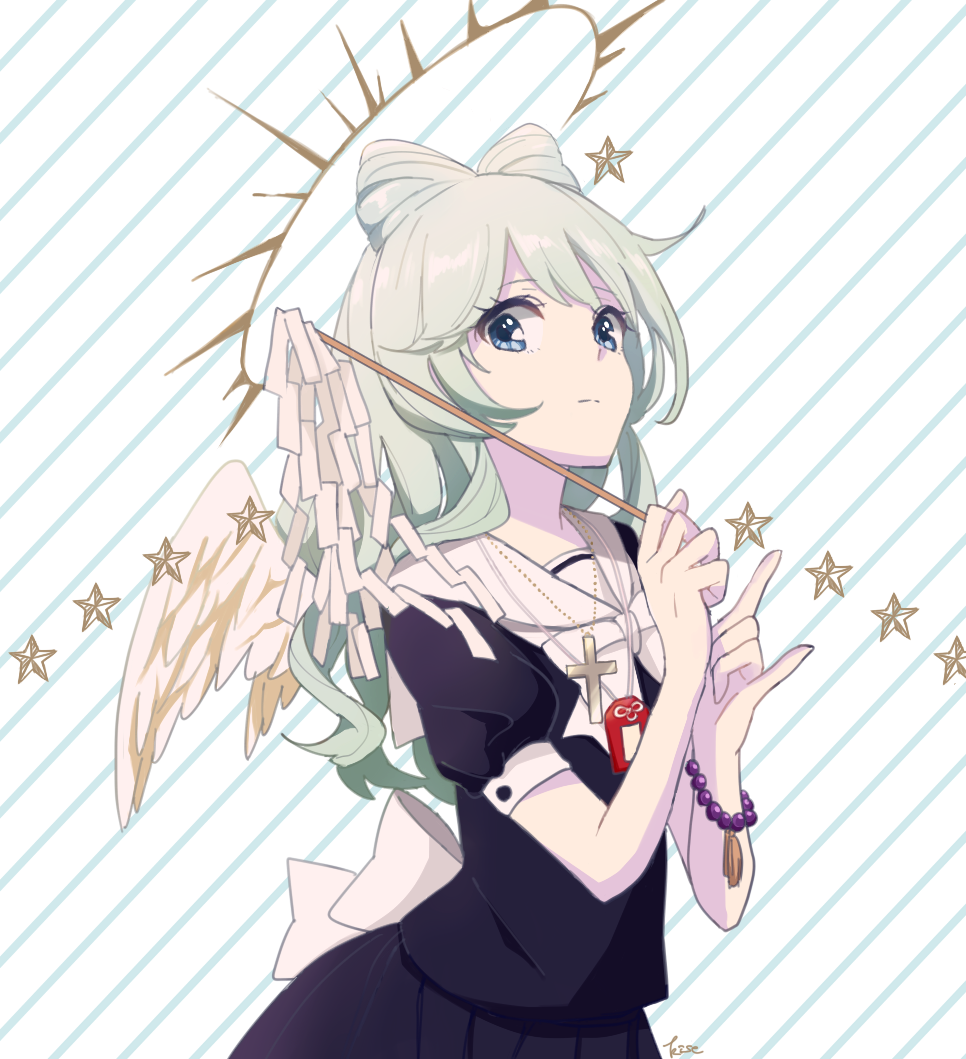 1girl \m/ angel angel_wings artist_name beads black_serafuku black_shirt black_skirt blue_eyes bracelet closed_mouth cross cross_necklace gohei green_hair hair_bun halo holding holding_gohei jewelry kise_(swimmt) long_hair looking_at_viewer necklace original pendant pleated_skirt sailor_collar school_uniform serafuku shide shirt short_sleeves signature skirt solo star_(symbol) striped_background white_sailor_collar wings