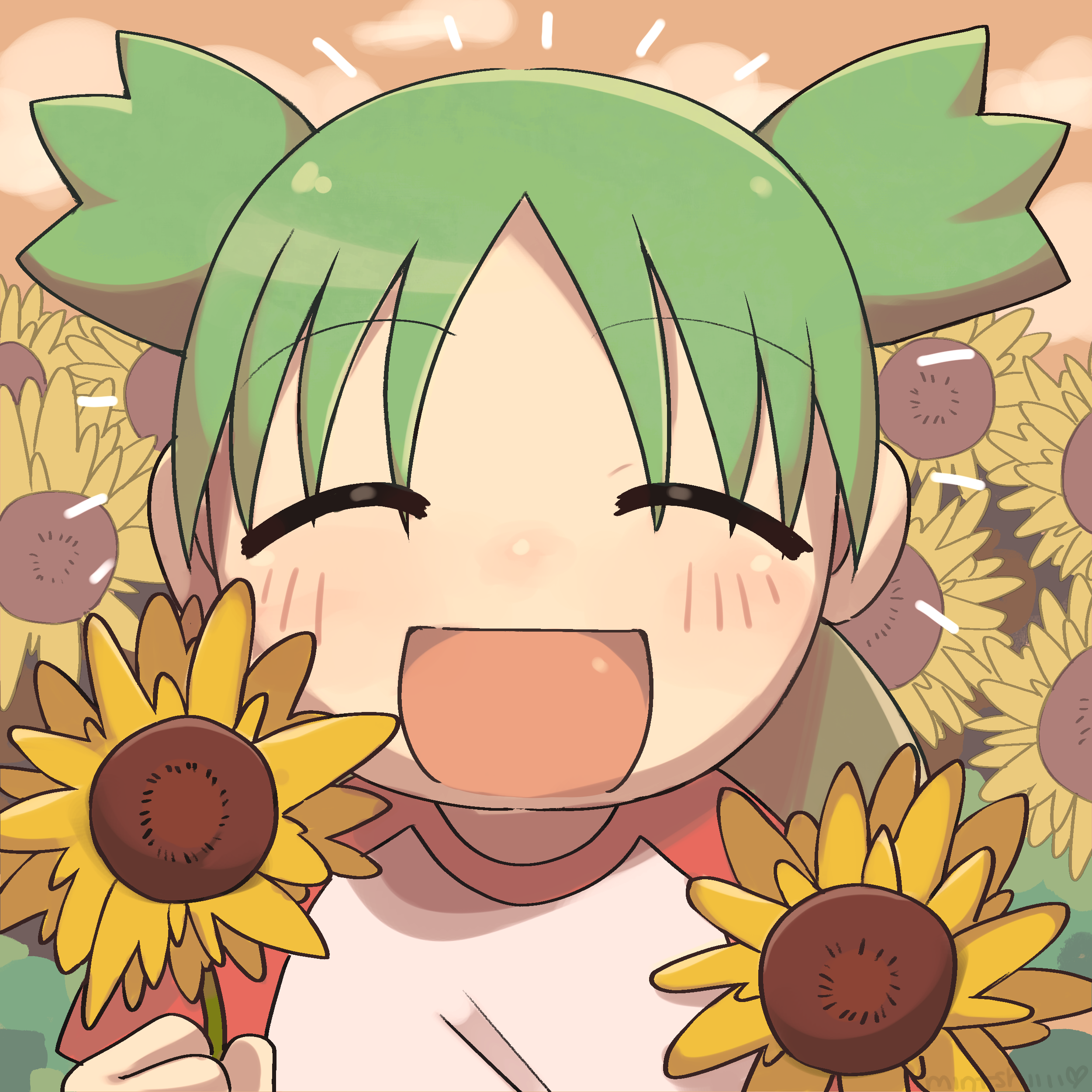 1girl absurdres commentary_request emphasis_lines field flower flower_field green_skirt highres holding holding_flower koiwai_yotsuba mintshiiii open_mouth quad_tails skirt smile solo sunflower sunflower_field upper_body yotsubato!