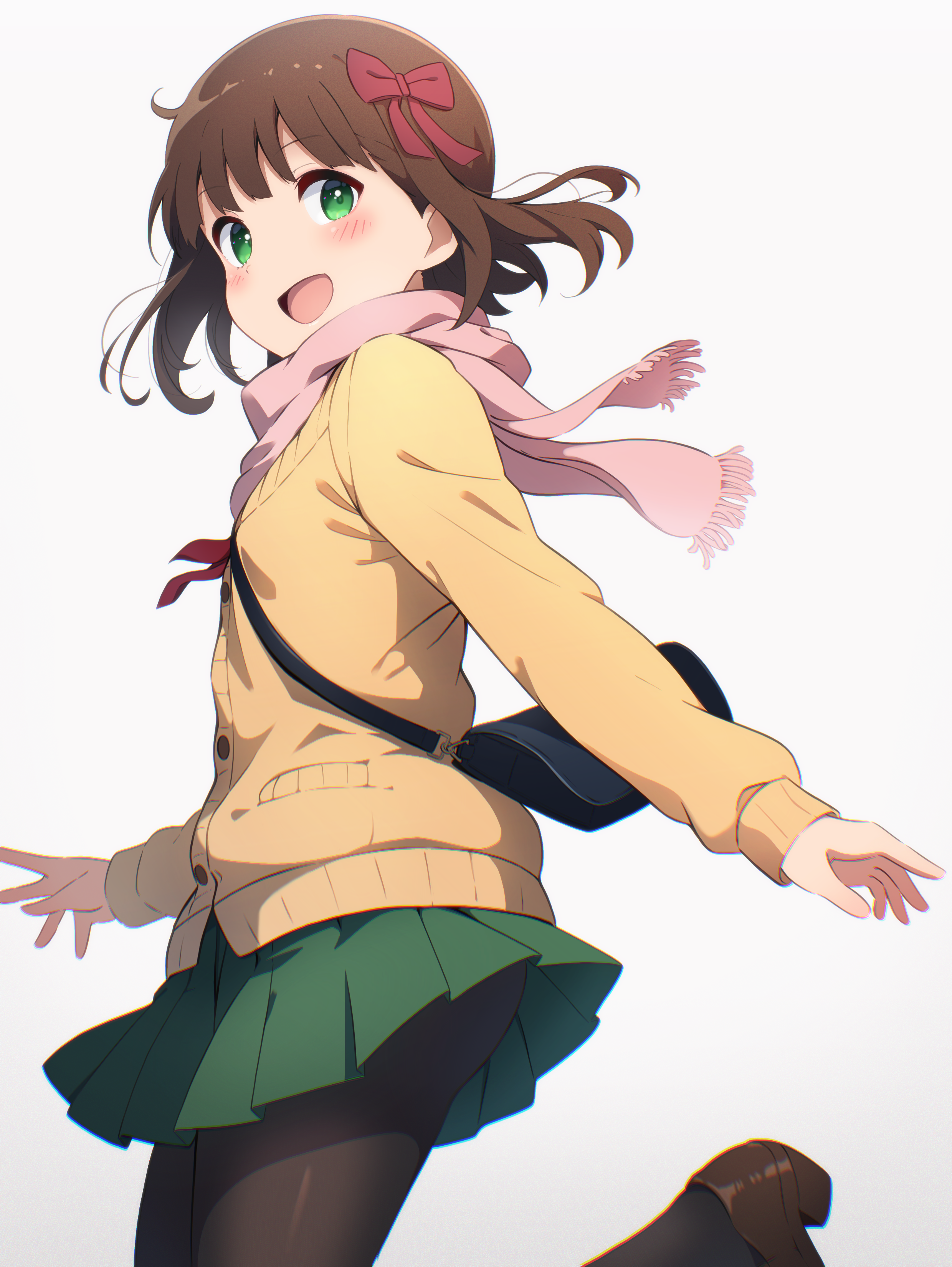 1girl :d absurdres amami_haruka black_pantyhose blush bow brown_hair brown_shoes cardigan floating_hair from_side green_eyes green_skirt gyorui_(katsuwo_drawing) hair_bow highres idolmaster idolmaster_(classic) loafers long_sleeves medium_hair miniskirt open_mouth pantyhose pink_scarf pleated_skirt red_bow scarf school_uniform shoes simple_background skirt smile solo standing standing_on_one_leg white_background yellow_cardigan