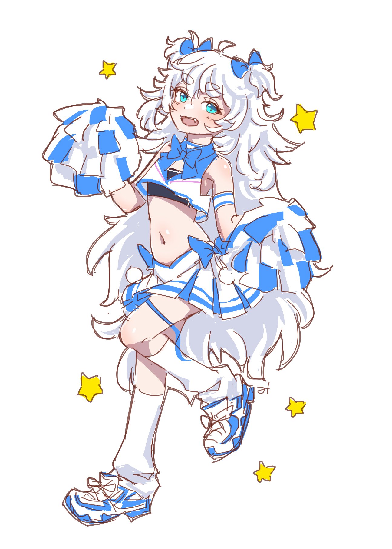 1girl :d black_sports_bra blue_eyes blue_skirt blush breasts cheerleader crop_top ex-mist fang goddess_of_victory:_nikke highres long_hair navel official_alternate_costume open_mouth poli_(cheer_up_police)_(nikke) poli_(nikke) pom_pom_(cheerleading) shoes sidelocks skirt small_breasts smile sneakers socks solo sports_bra two-tone_skirt very_long_hair wavy_hair white_hair white_skirt white_socks