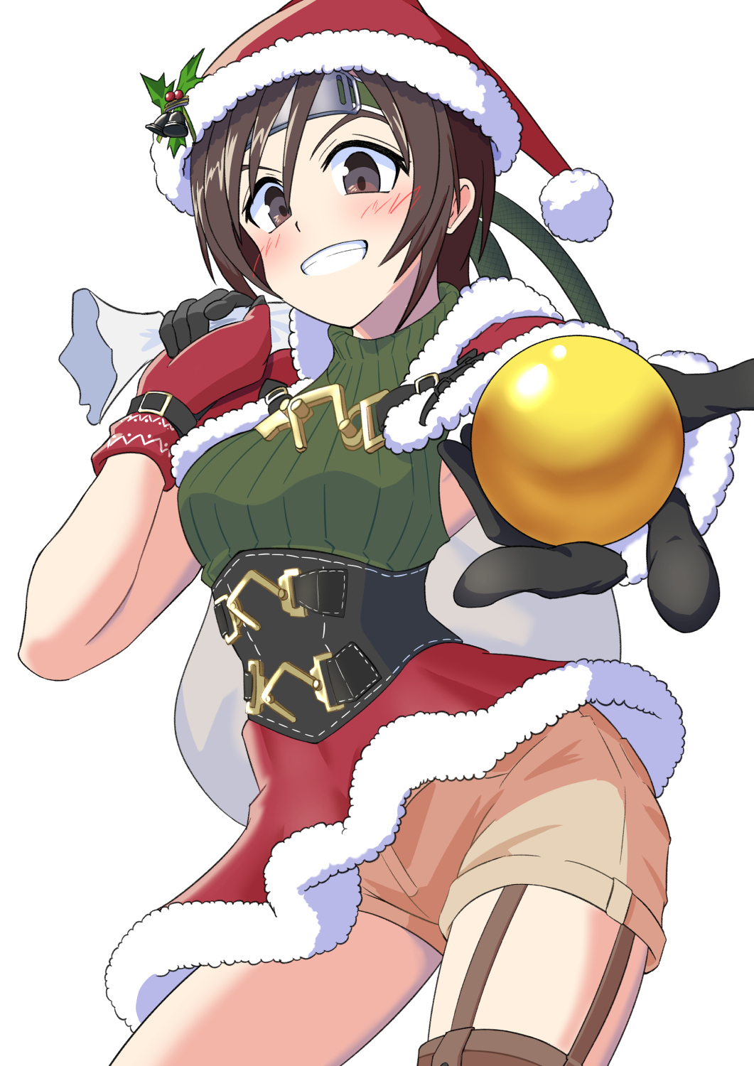 1girl :d adapted_costume black_corset black_gloves blush breasts brown_eyes brown_hair brown_shorts capelet commentary corset cosplay cowboy_shot final_fantasy final_fantasy_vii fur-trimmed_capelet fur-trimmed_headwear fur-trimmed_skirt fur_trim garter_straps gloves green_sweater grin hair_between_eyes hat hat_bell hat_ornament highres holding holding_sack holly holly_hat_ornament kazaguruma2600 materia medium_breasts open_mouth parted_lips pom_pom_(clothes) reaching reaching_towards_viewer red_capelet red_gloves red_hat red_skirt ribbed_sweater sack santa_costume santa_hat short_hair short_shorts shorts shorts_under_skirt simple_background skirt sleeveless sleeveless_turtleneck smile solo standing sweater tifa_lockhart tifa_lockhart_(cosplay) tifa_lockhart_(fairy_of_the_holy_flame) turtleneck turtleneck_sweater two-tone_gloves white_background yuffie_kisaragi