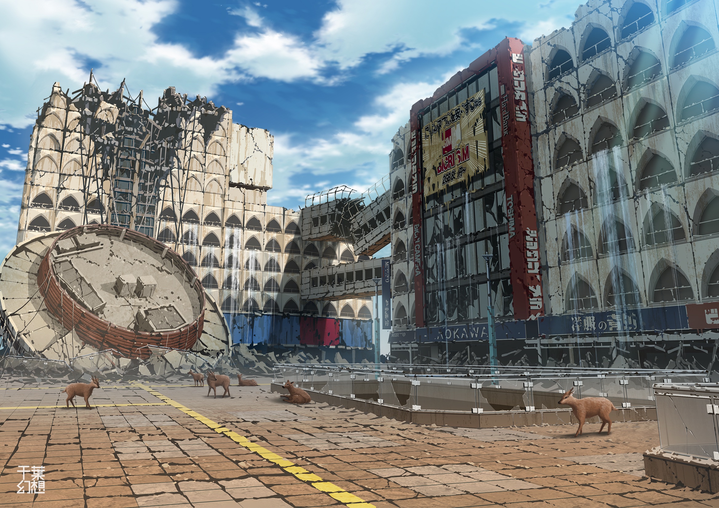 abandoned animal blue_sky broken_window building cloud cloudy_sky commentary_request day debris deer dilapidated highres no_humans original outdoors post-apocalypse ruins rust scenery sky tokyogenso water waterfall