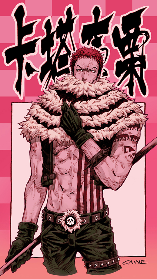 1boy abs arm_tattoo artist_name black_gloves bracelet caine666 charlotte_katakuri chest_tattoo covered_mouth gloves holding holding_polearm holding_weapon jacket jewelry male_focus one_piece open_clothes open_jacket polearm red_eyes red_hair scarf scarf_over_mouth short_hair sleeveless sleeveless_jacket solo spiked_bracelet spikes tattoo third-party_source translation_request weapon