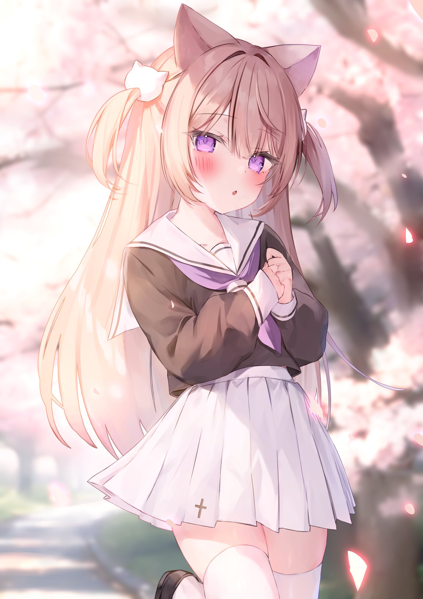 1girl :o animal_ears black_shirt blurry blurry_background blush cat_ears cat_girl cherry_blossoms commission day falling_petals foot_up hair_between_eyes hair_intakes hakua_aa highres knees_together_feet_apart light_brown_hair long_hair long_sleeves looking_at_viewer miniskirt neckerchief open_mouth original outdoors own_hands_together petals pleated_skirt purple_eyes purple_neckerchief sailor_collar school_uniform serafuku shirt sidelocks skeb_commission skirt solo standing thighhighs two_side_up white_sailor_collar white_skirt white_thighhighs zettai_ryouiki