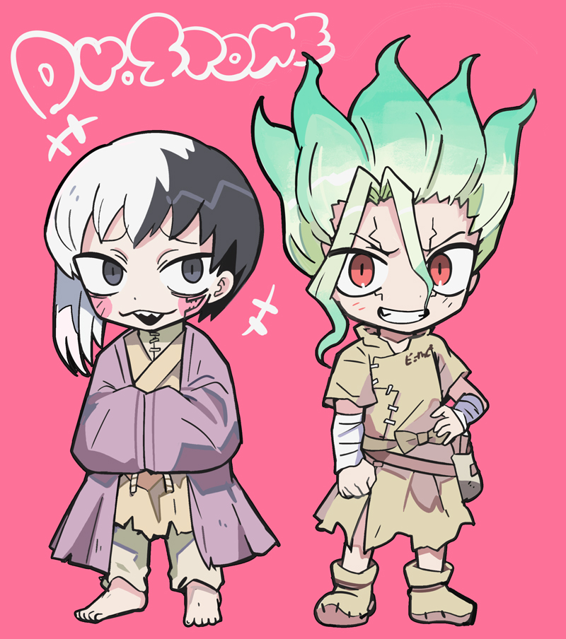 +++ 2boys asagiri_gen asymmetrical_hair bandaged_arm bandages barefoot belt belt_bag black_eyes black_hair blue_sleeves blush_stickers boots bow brown_bag brown_belt brown_bow brown_footwear brown_tunic commentary_request copyright_request dr._stone full_body green_hair grin hair_between_eyes hand_on_own_hip ishigami_senkuu long_sleeves looking_at_viewer male_focus marking_on_cheek multicolored_hair multiple_boys open_clothes open_mouth open_robe own_hands_together pants patchwork_clothes pink_background purple_robe purple_sleeves raised_eyebrows red_eyes robe sharp_teeth short_hair short_sleeves simple_background smile spiked_hair standing teeth terada_tera toes tunic two-tone_hair upper_teeth_only v-shaped_eyebrows waist_bow white_hair white_pants