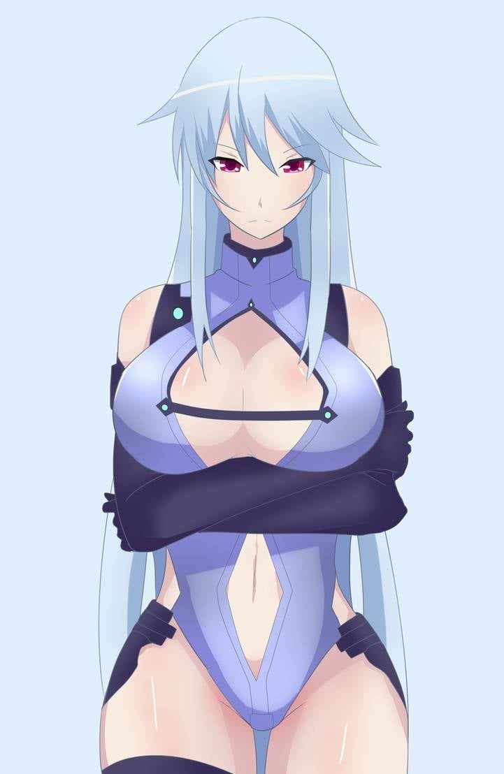 1girl bodysuit breasts chidorigafuchi_aine cleavage frown gloves large_breasts leotard lickliking long_hair masou_gakuen_hxh red_eyes white_hair