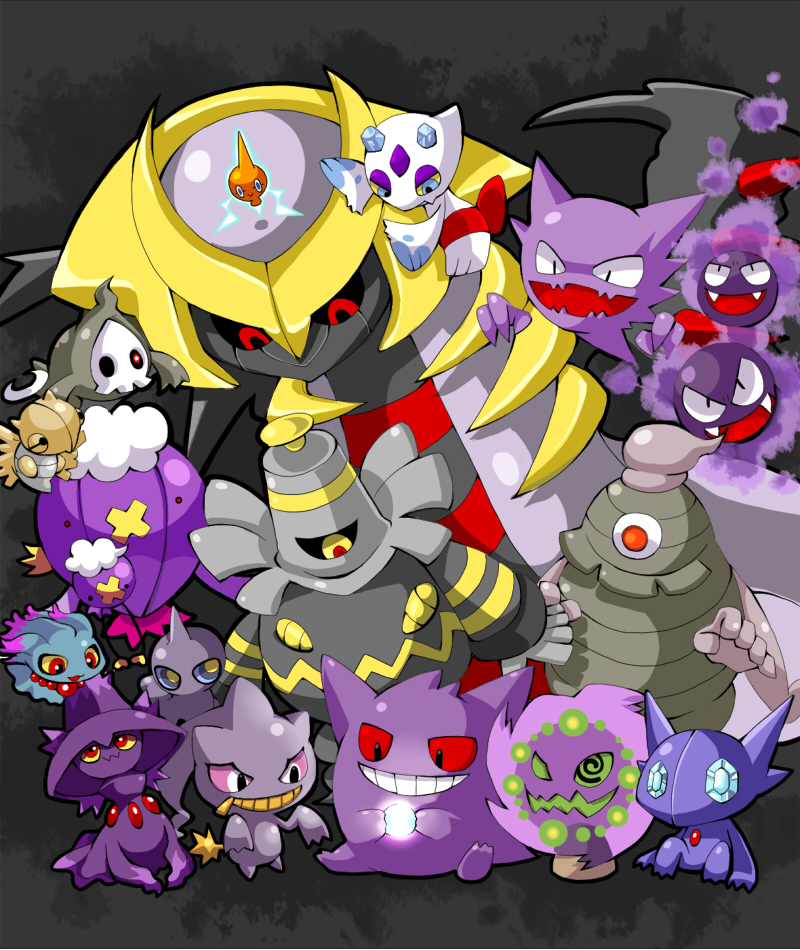 @_@ banette black_sclera colored_sclera drifblim drifloon dusclops dusknoir duskull fangs floating froslass gastly gem gen_1_pokemon gen_2_pokemon gen_3_pokemon gen_4_pokemon gengar giratina green_sclera grey_background haunter holding kotomaru_(kotokoto_kottan) legendary_pokemon looking_at_another looking_down misdreavus mismagius nintendo no_humans open_mouth pokemon pokemon_(creature) rayman_limbs red_eyes red_pupils rotom rotom_(normal) sableye shedinja sitting spiritomb yellow_eyes yellow_sclera zipper_pull_tab