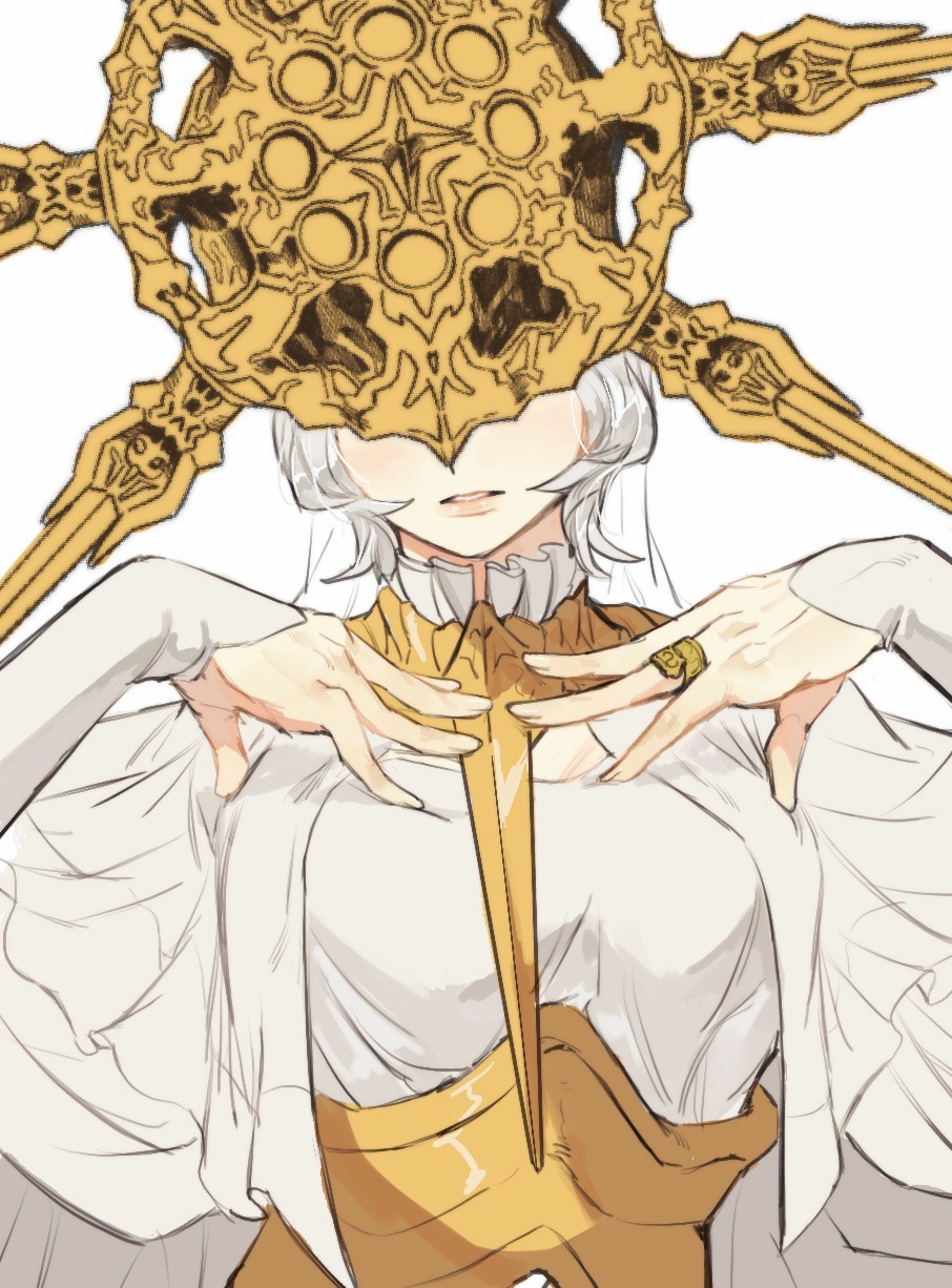 1boy breasts dark_souls_(series) dark_souls_i dark_sun_gwyndolin dress gold_headwear grey_hair hands_up helmet highres jewelry large_breasts long_sleeves male_focus male_with_breasts parted_lips ring short_hair simple_background solo spiked_helmet teeth trap white_background zunkome
