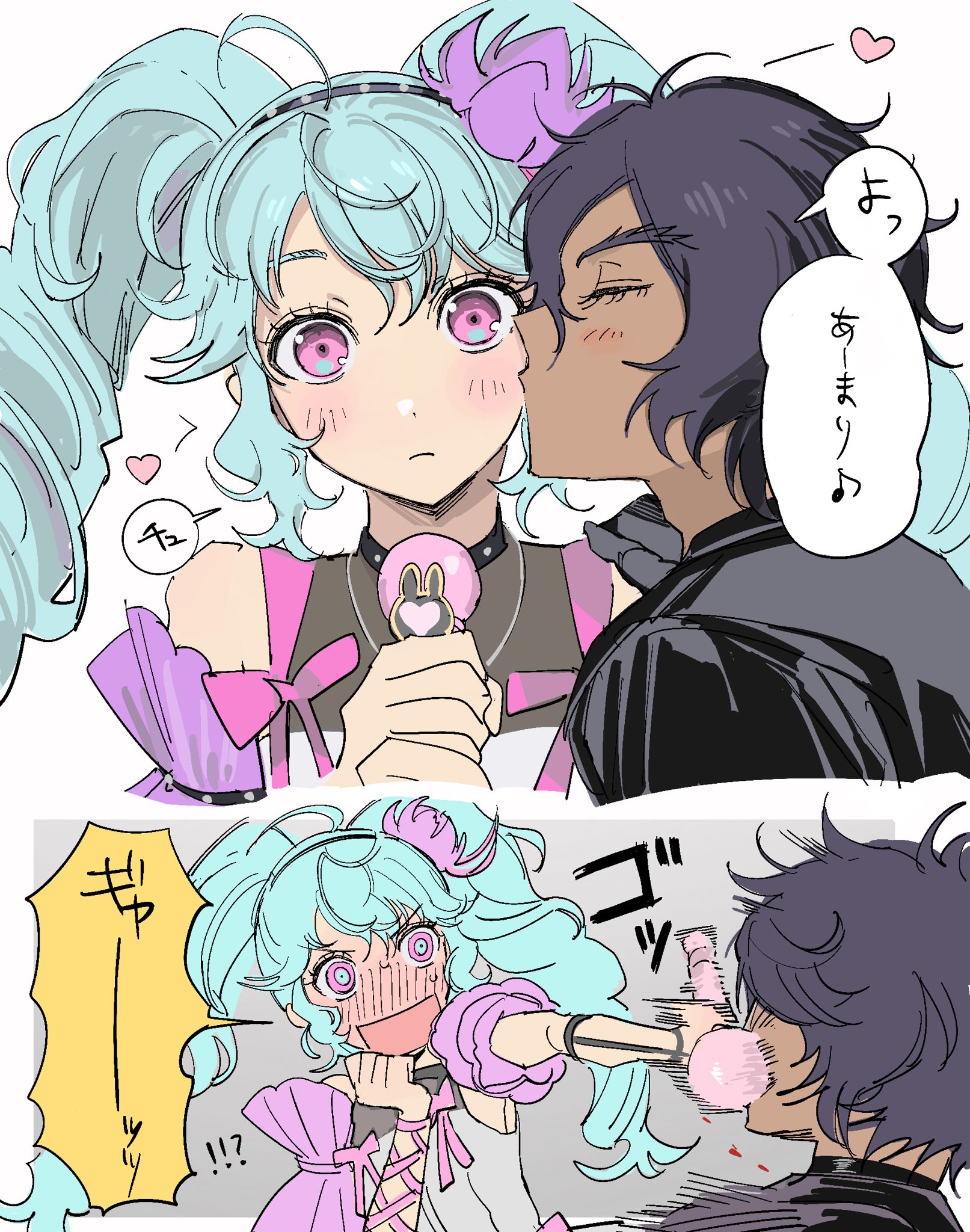 1boy 1girl ahoge black_hair blue_hair blush closed_eyes commentary_request cropped_torso dark-skinned_male dark_skin embarrassed hetero highres idol_land_pripara katasumi_amari kiss kissing_cheek long_hair looking_at_another mario_(pripara) microphone open_mouth pretty_series pripara pushing_away short_hair smile speech_bubble translation_request twintails upper_body yumei_(jigoku101)