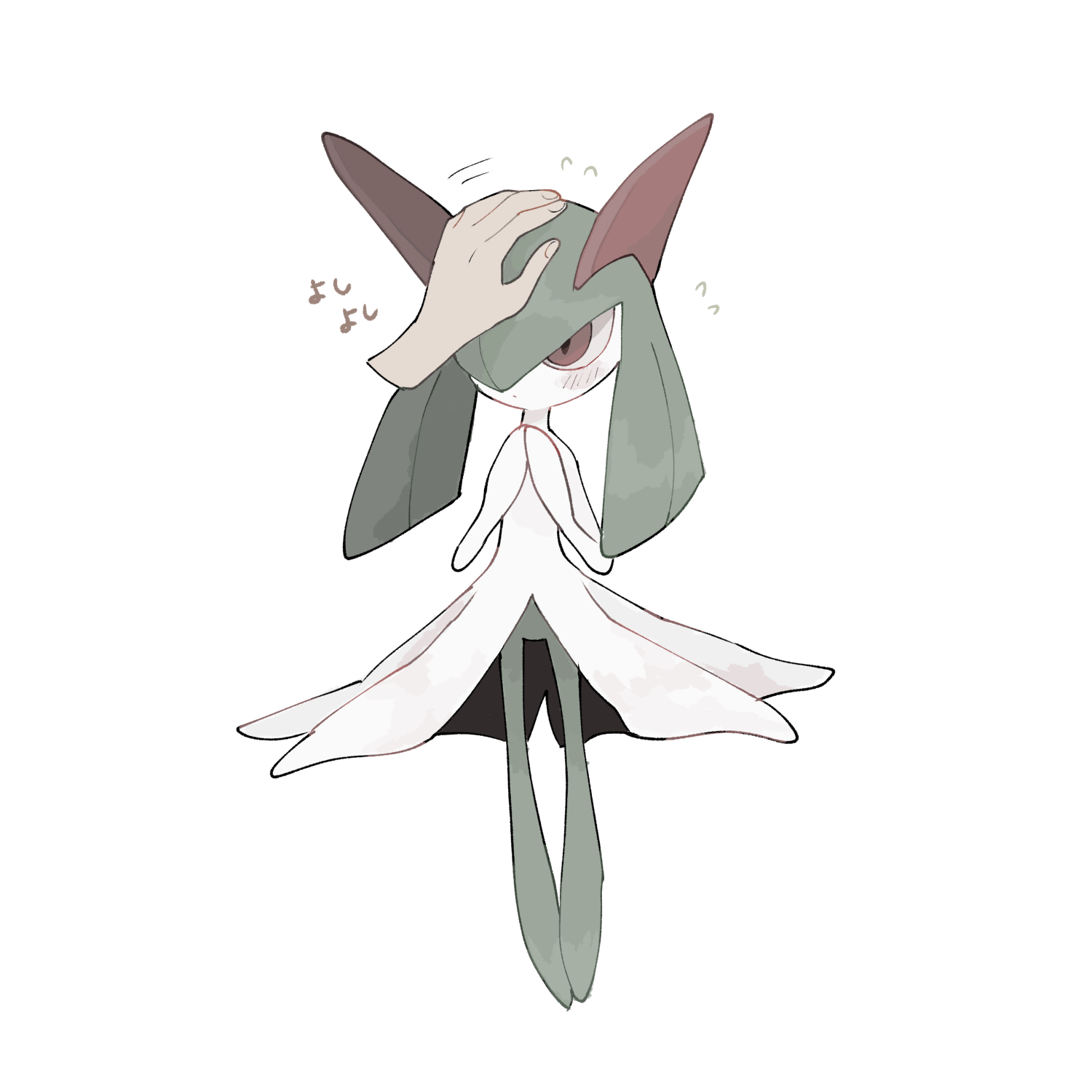 blush colored_skin disembodied_hand flying_sweatdrops gen_3_pokemon green_hair hair_over_one_eye headpat highres kirlia kurosuke_(krsk_8x8x) multicolored_skin nintendo no_feet own_hands_together pokemon pokemon_(creature) sidelocks simple_background two-tone_skin white_background white_skin