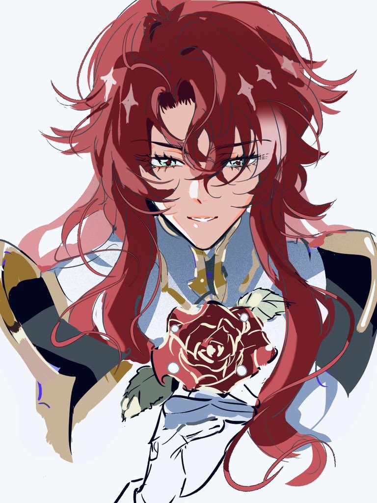 1girl argenti_(honkai:_star_rail) armor flower gloves green_eyes holding holding_flower honkai:_star_rail honkai_(series) knight leaf long_eyelashes long_hair looking_down parted_bangs parted_lips red_flower red_hair red_rose rose shadow shoulder_armor sketch smile upper_body violetpuppy1 white_background white_gloves