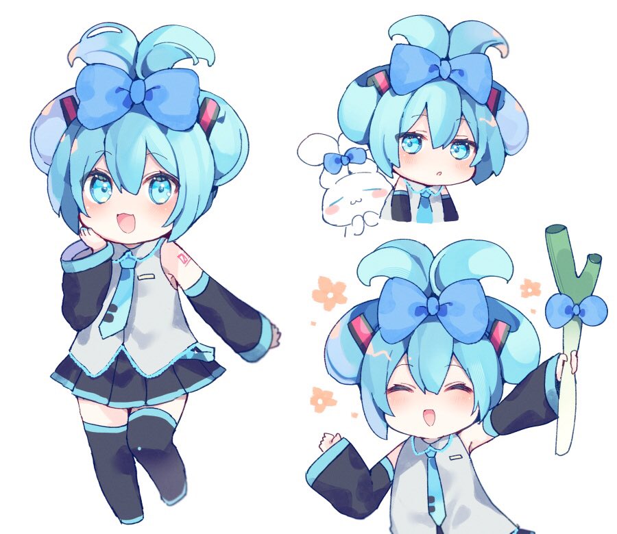 1girl :3 :d aqua_eyes aqua_hair aqua_necktie arm_tattoo arm_up black_sleeves black_thighhighs blue_bow blue_nails blush bow chestnut_mouth chibi cinnamiku cinnamoroll closed_eyes collared_shirt commentary detached_sleeves flower_symbol food fuwa_fuwa_cinnamoroll grey_shirt hair_between_eyes hair_bow happy hatsune_miku headphones holding holding_food holding_spring_onion holding_vegetable long_hair long_sleeves looking_at_viewer mogu_(wy5xrt7w) multiple_views nail_polish necktie open_mouth sanrio shirt simple_background smile spring_onion standing standing_on_one_leg tattoo thighhighs updo vegetable vocaloid white_background